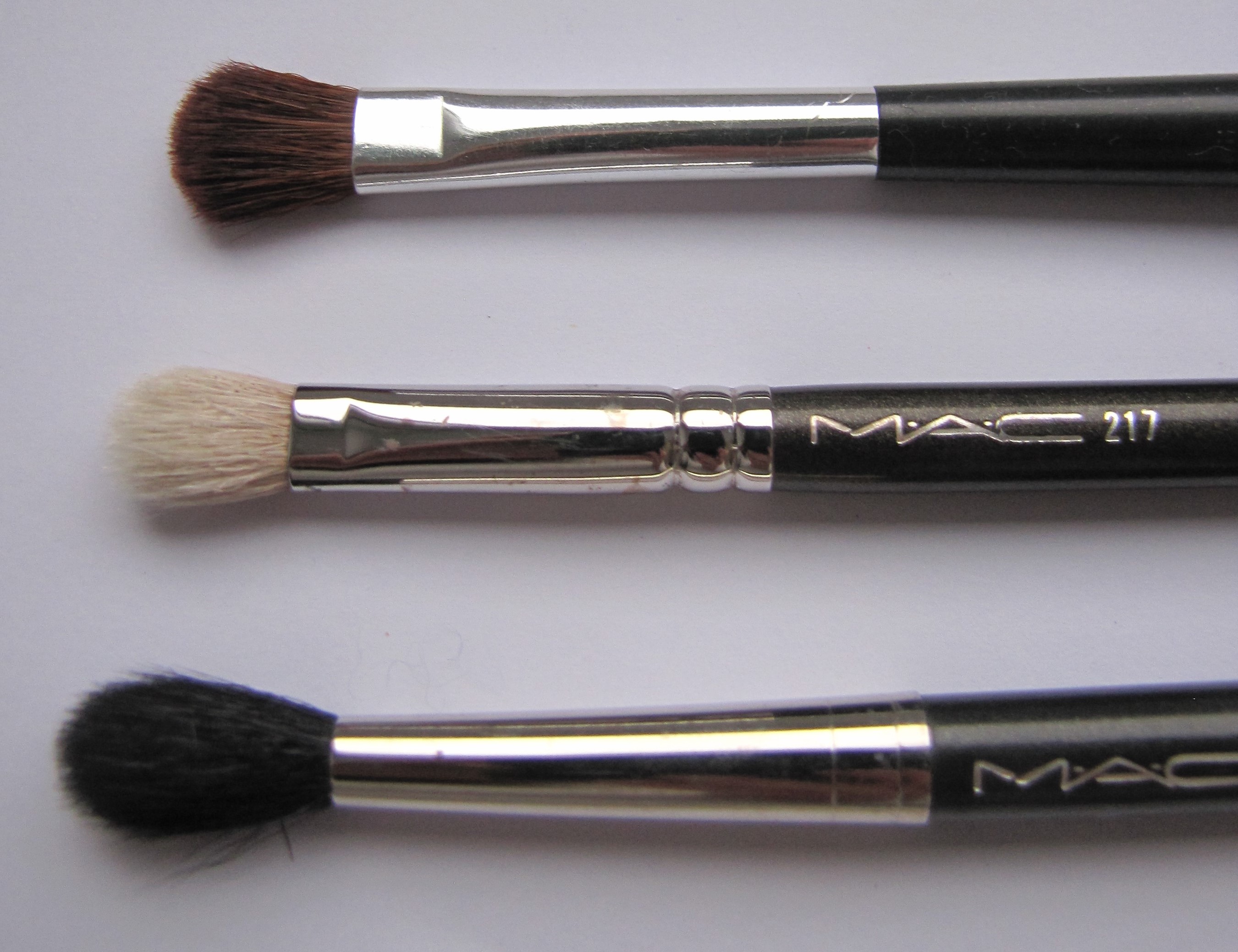 Crease Brushes shown above right from top to bottom: Real Techniques Essential Crease Brush (Taklon; part of Nic’s Picks Brush Set); Real Techniques Domed Crease Brush (Taklon; part of the Real Techniques Eye Starter Set); MAC 226 brush (natural; limited edition); MAC 217 brush (natural); MAC 224 brush (natural).