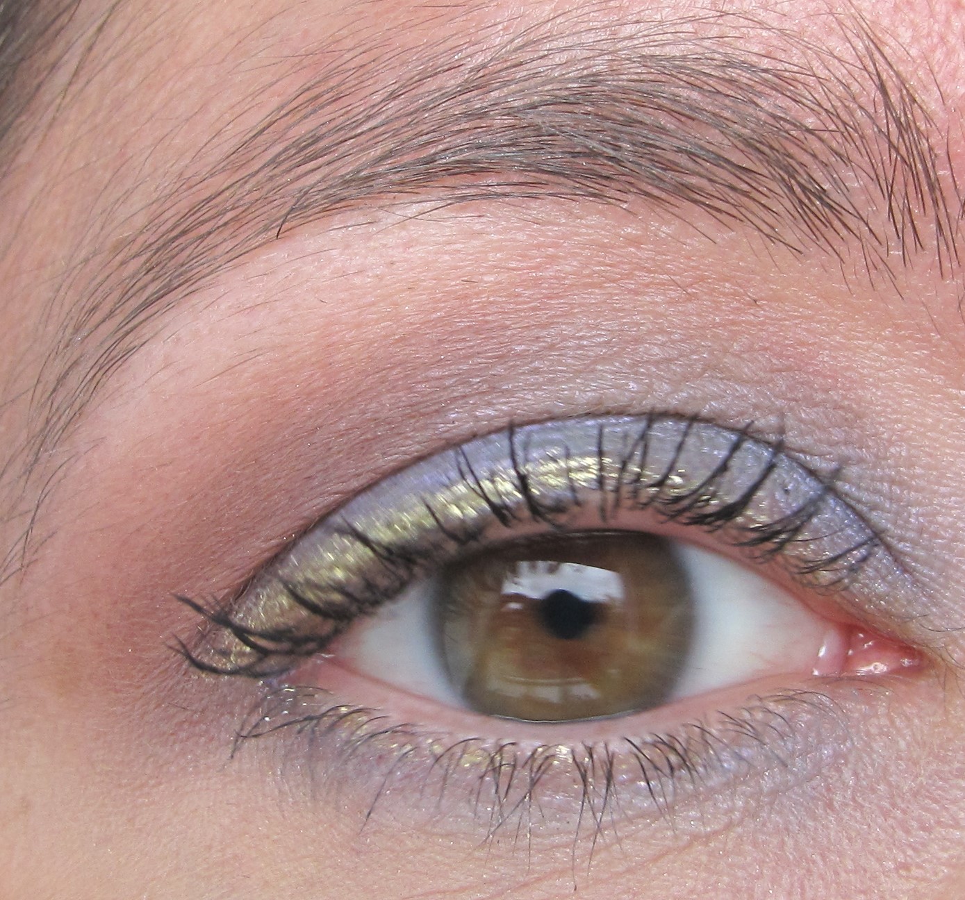 For this look, I paired a bright yellow-gold with a bluish-purple eyeshadow to create a pretty, vivid effect. Using an eyeliner which is lighter than the eyeshadows on the lid is a fun way to create some interesting contrast on the eyes.
