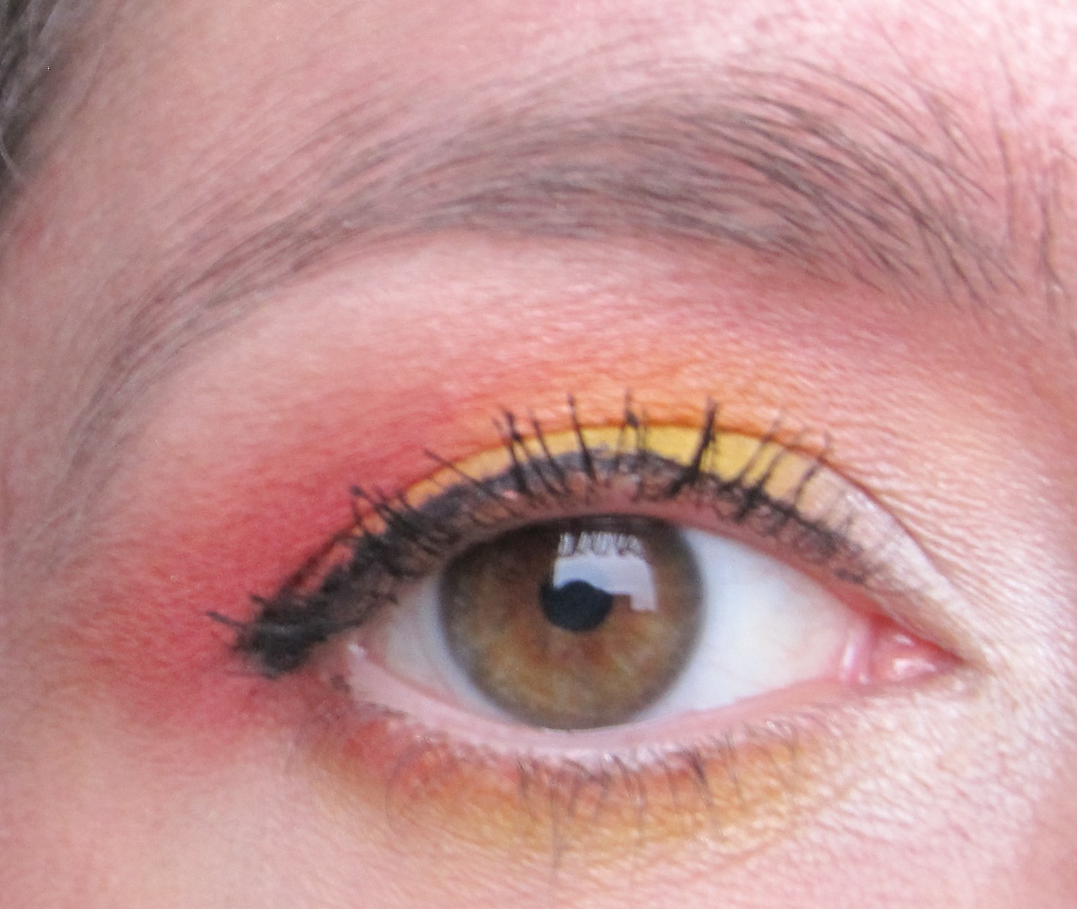Lower Lashline: MAC White Frost eyeshadow (as above) + MAC Chrome Yellow + MAC Hot Hot Hot eyeshadow (as above)