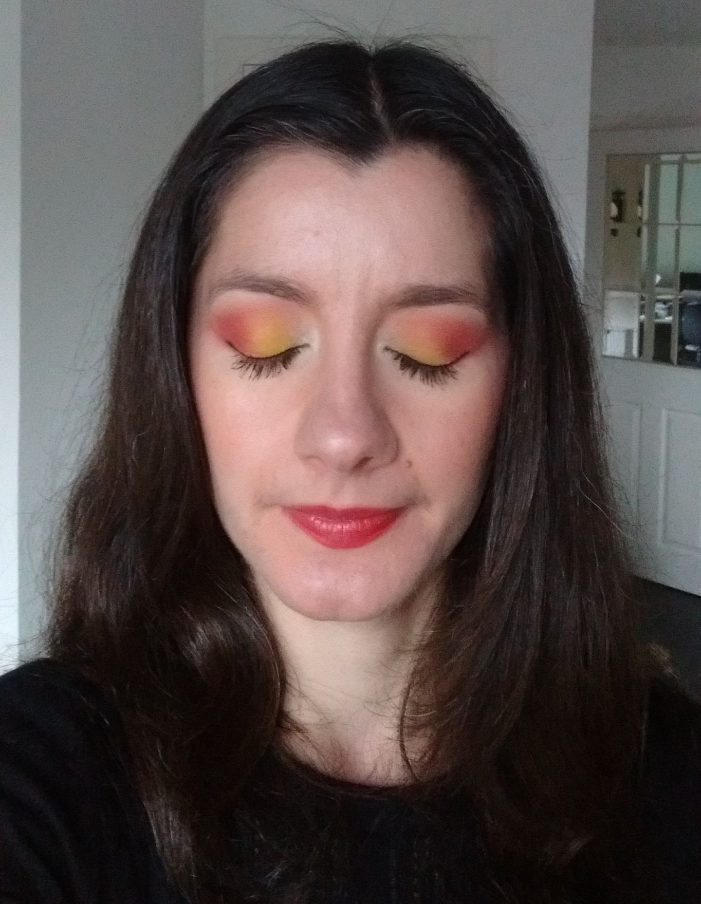 4. Take a flat shader brush (e.g. MAC 239) and pat Chrome Yellow on the middle of the lid. Overlap Chrome Yellow very slightly with where it meets the outer lid to help the shades blend together. Don’t take it too far into the outer lid, as you want to keep the intensity of the red shade in the outer part of the eye.