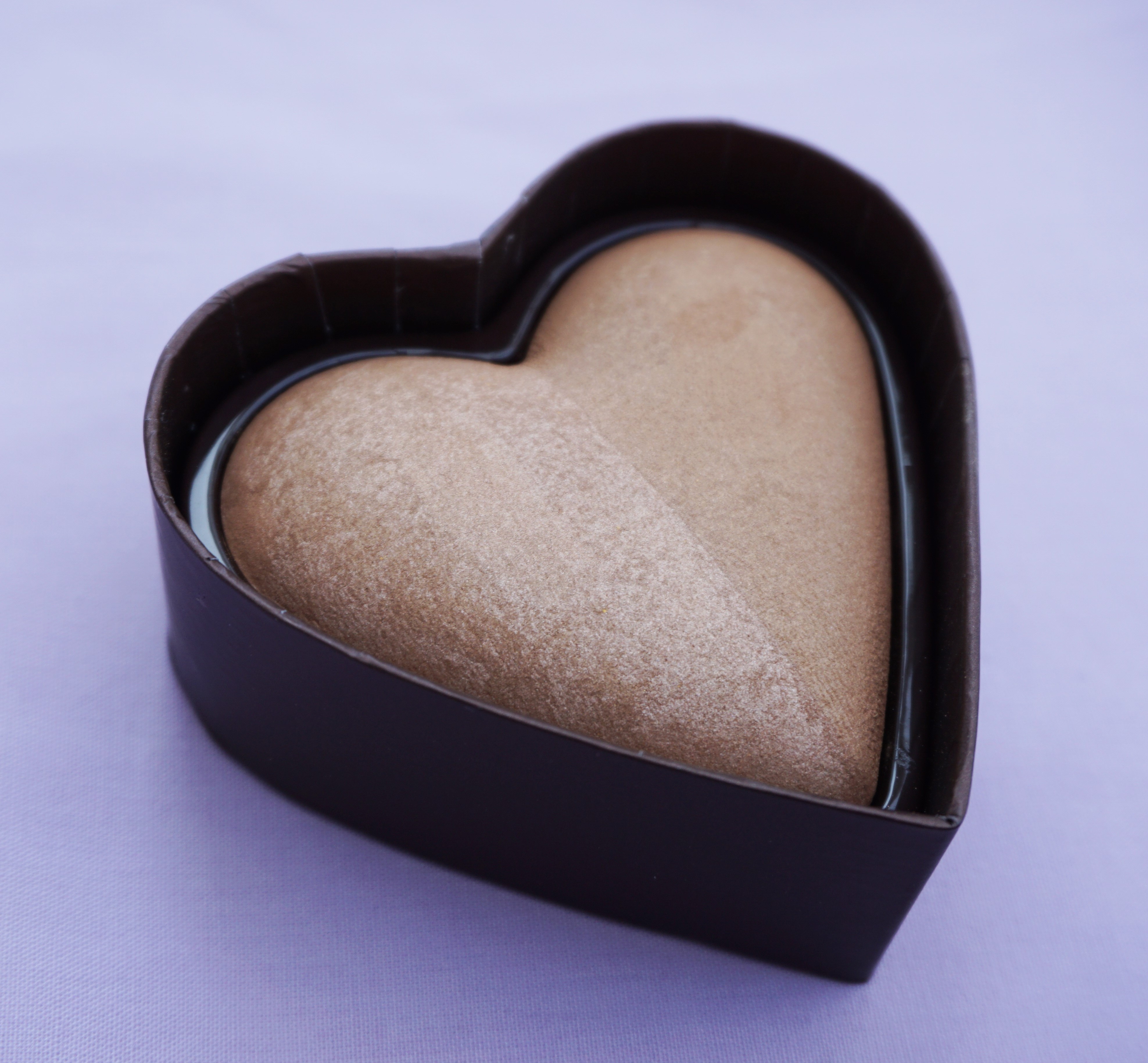 The bronzer itself comes encased in a deep chocolate brown, heart shaped box. It is topped with an aqua lid mimicking the outer box colour scheme.