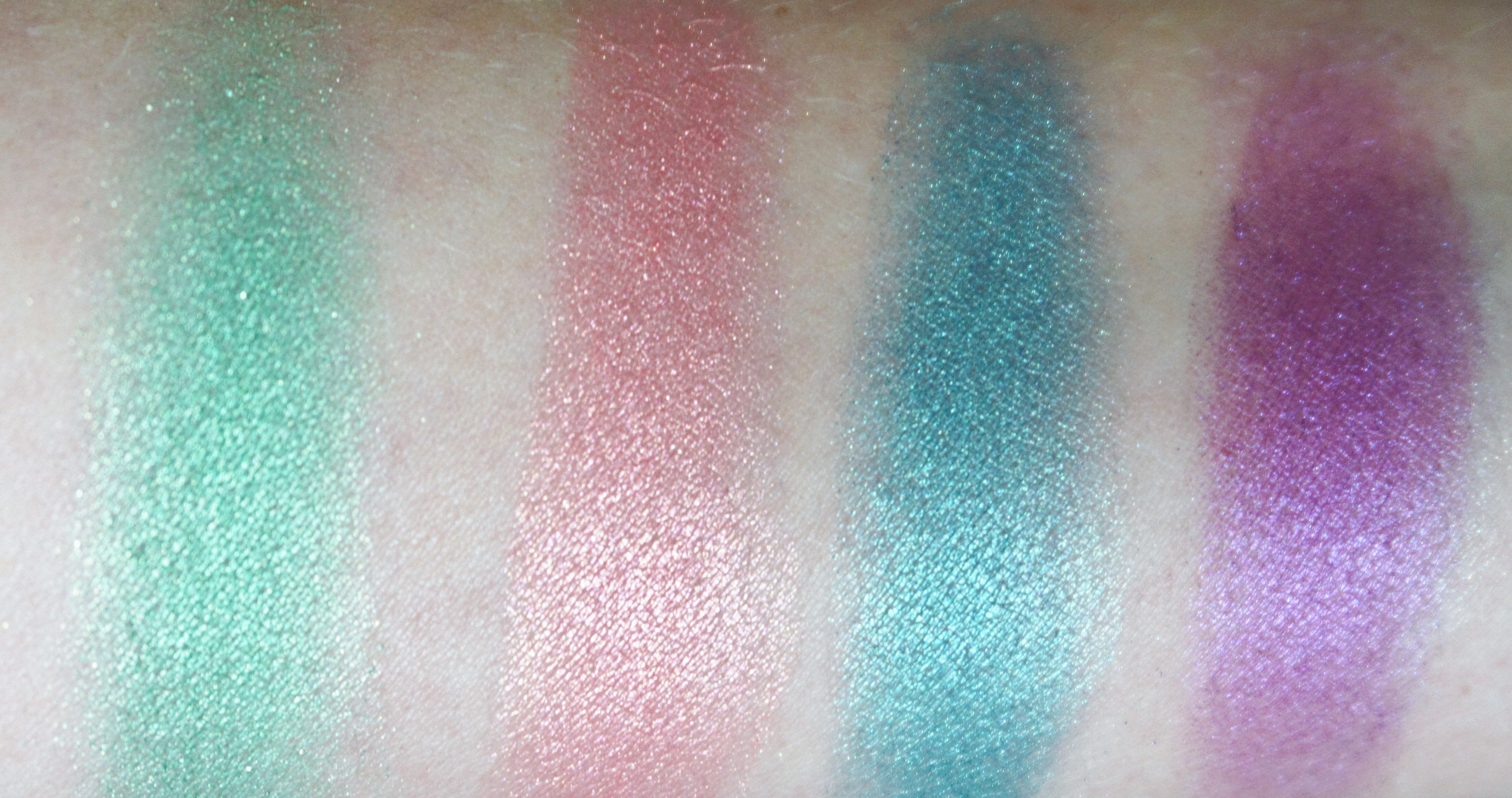 212 Emerald Green is a shimmery, medium aquamarine-green shade. I’m not quite sure why they called it Emerald Green, as it doesn’t look that way so much to me. It has much more of a teal/aqua cast to it and is similar in vein to shades like MAC Steamy and MAC Shimmermoss (which is now discontinued). Nevertheless, it is a gorgeous shade. I love combining this type of colour with purples or cobalt blues on the eyes. It would also look really pretty with pinks, golds and deeper greens.