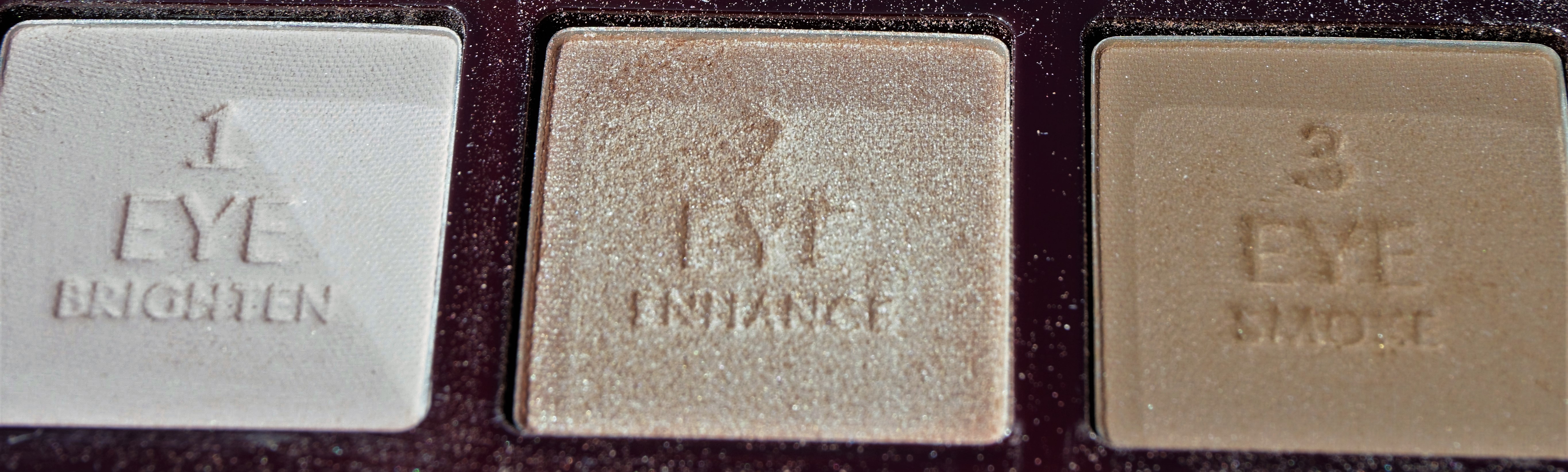 Eyeshadows from left to right (top row of palette): Shade 1 Eye Brighten; Shade 2 Eye Enhance; Shade 3 Eye Smoke