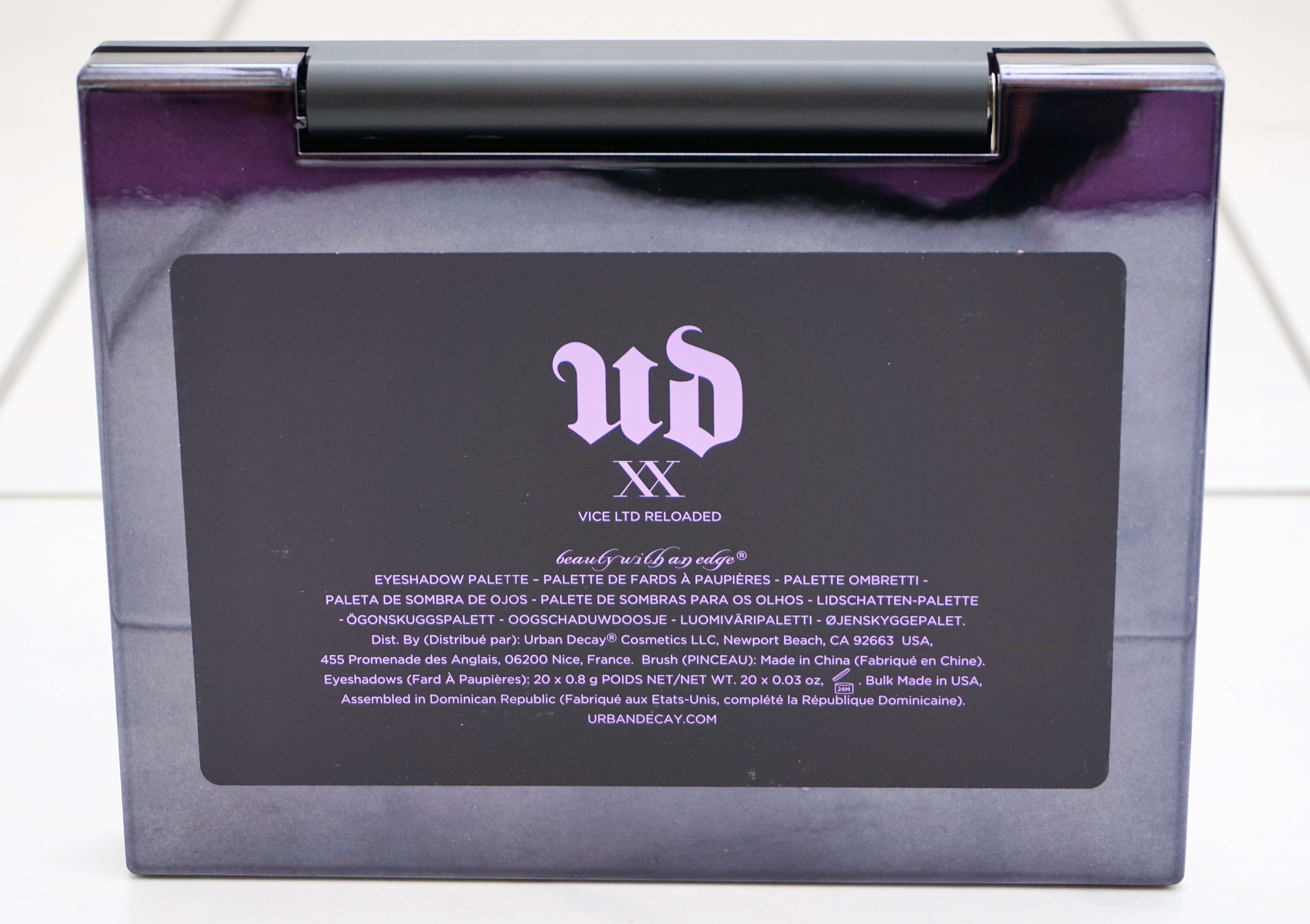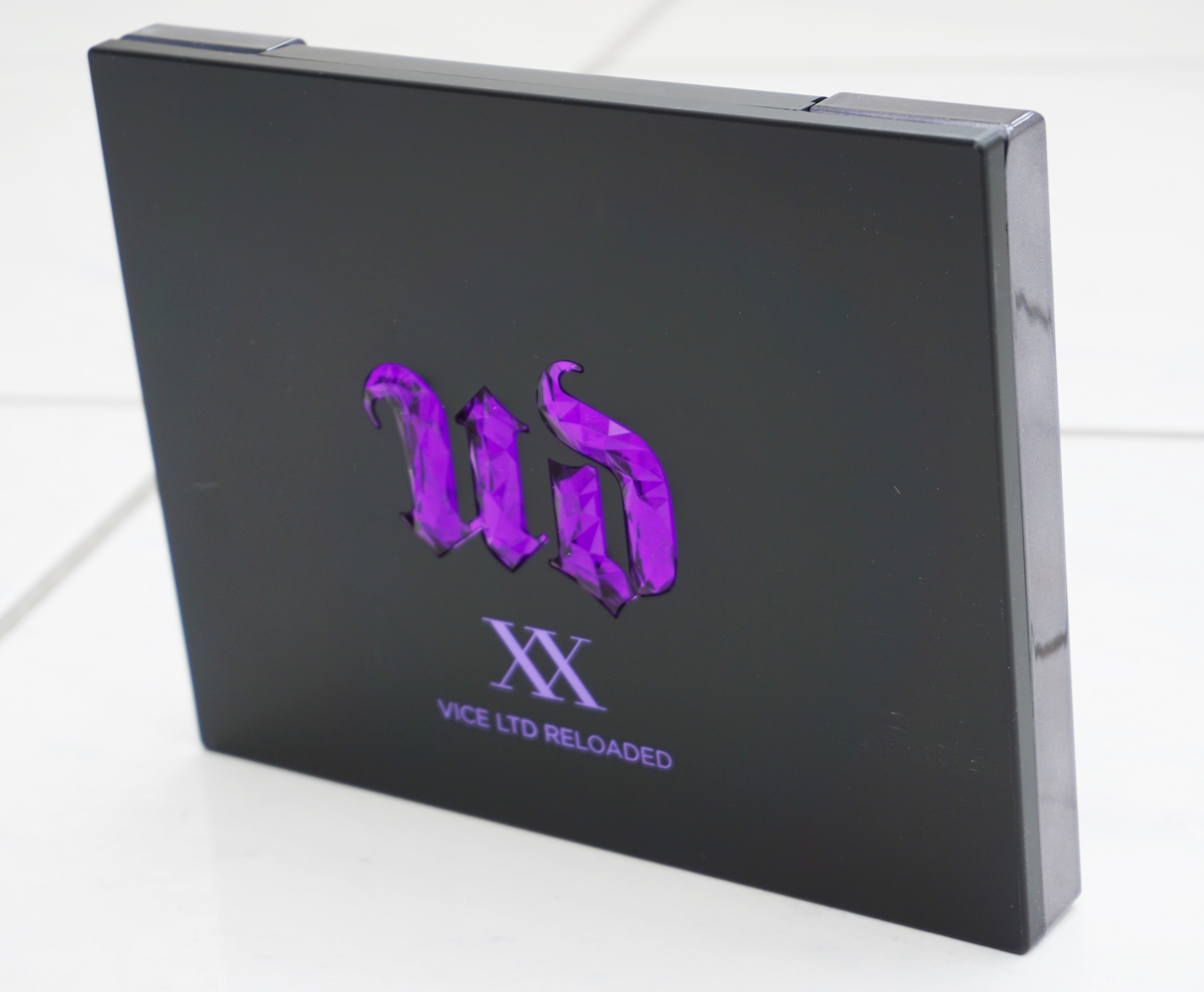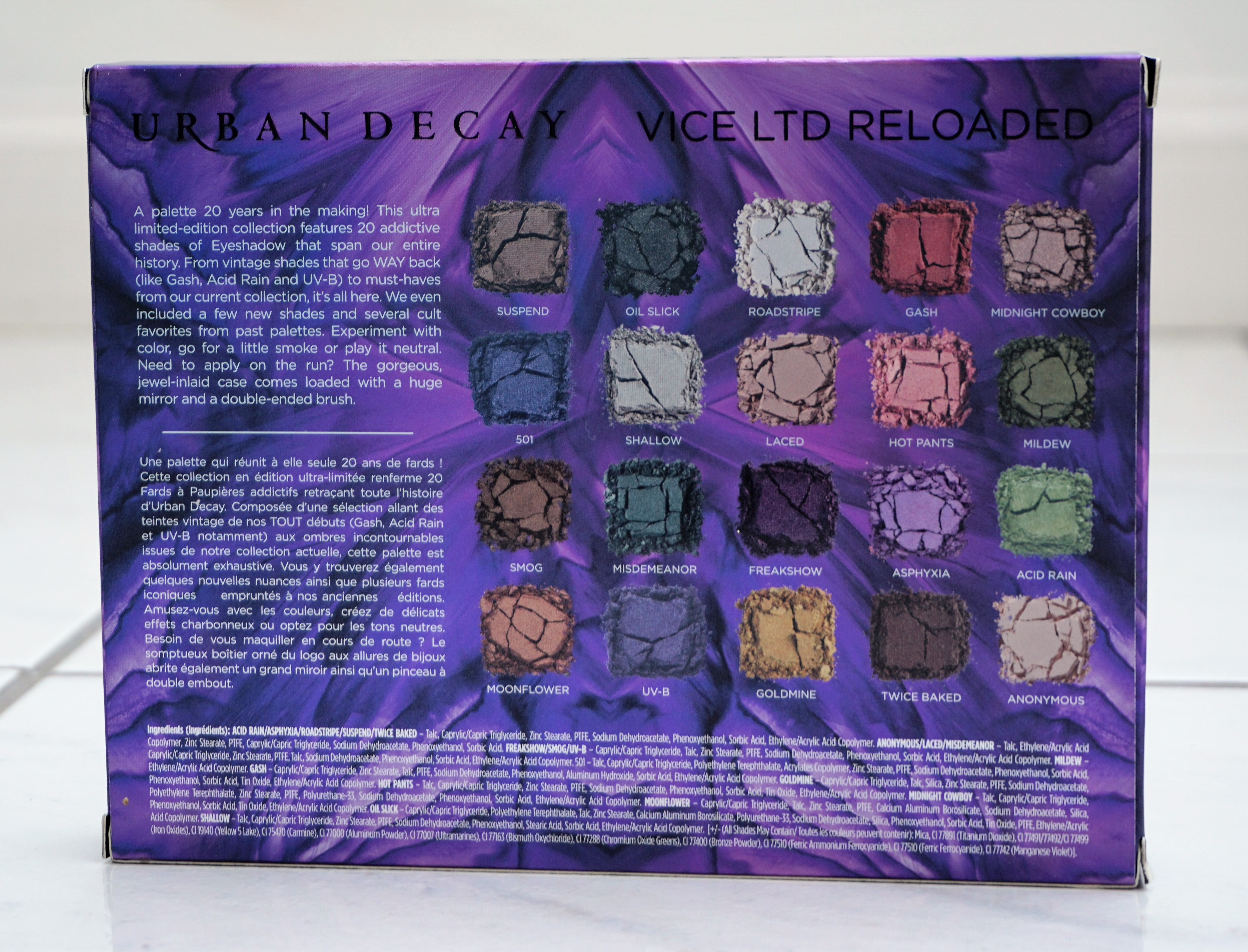 The XX Vice Ltd Reloaded comes in a purple box with a swirled design over the front and back. The front of the box has the Urban Decay slogan and the name of the palette in black lettering. The back of the box has mini pictures and names of the shades contained in the palette.