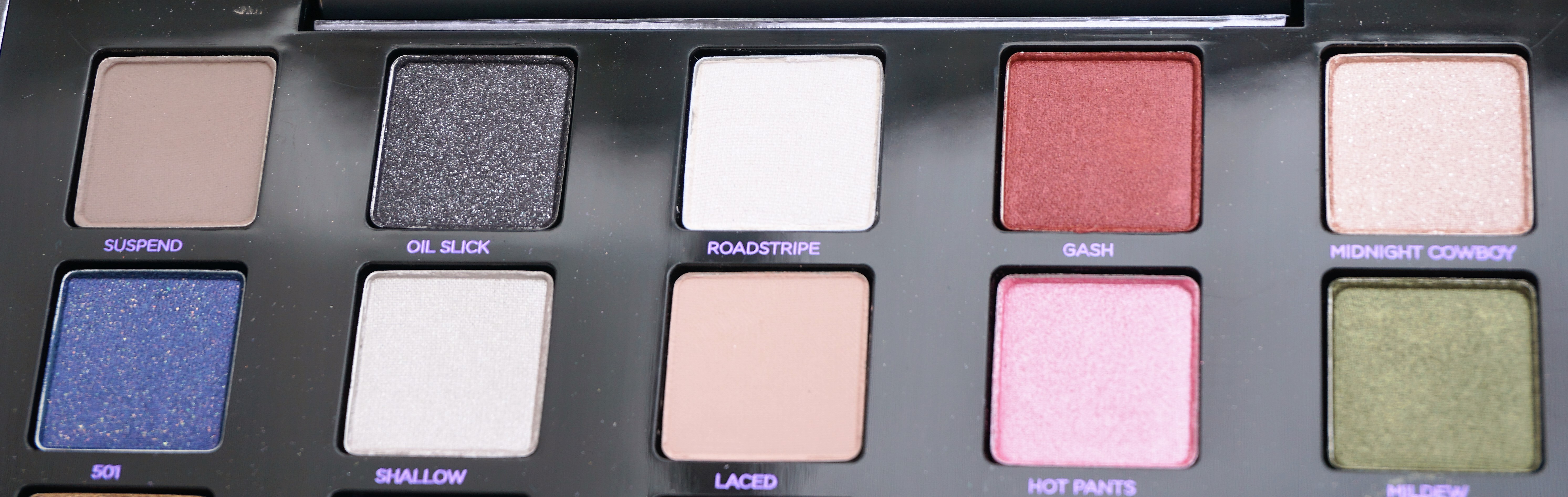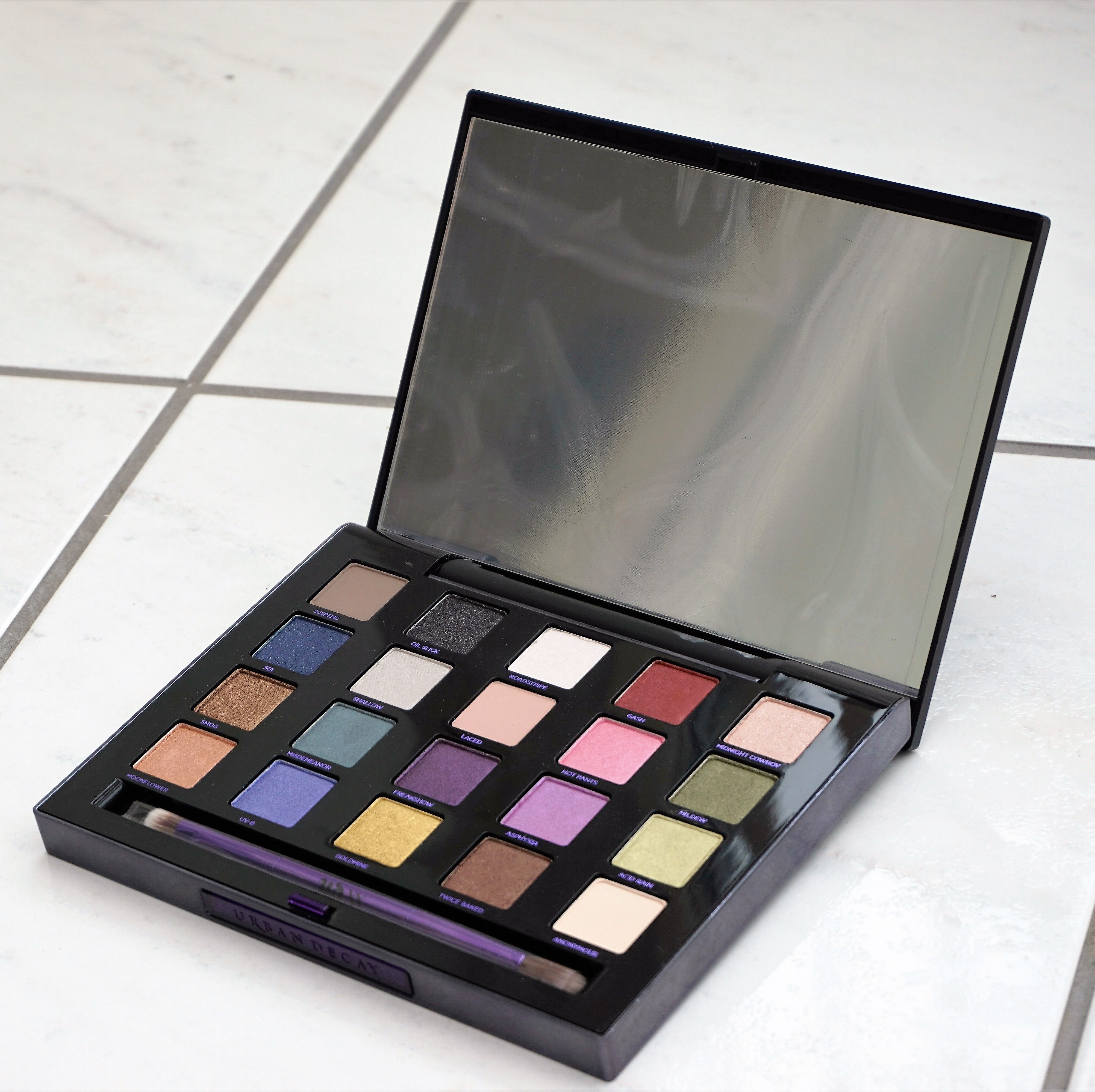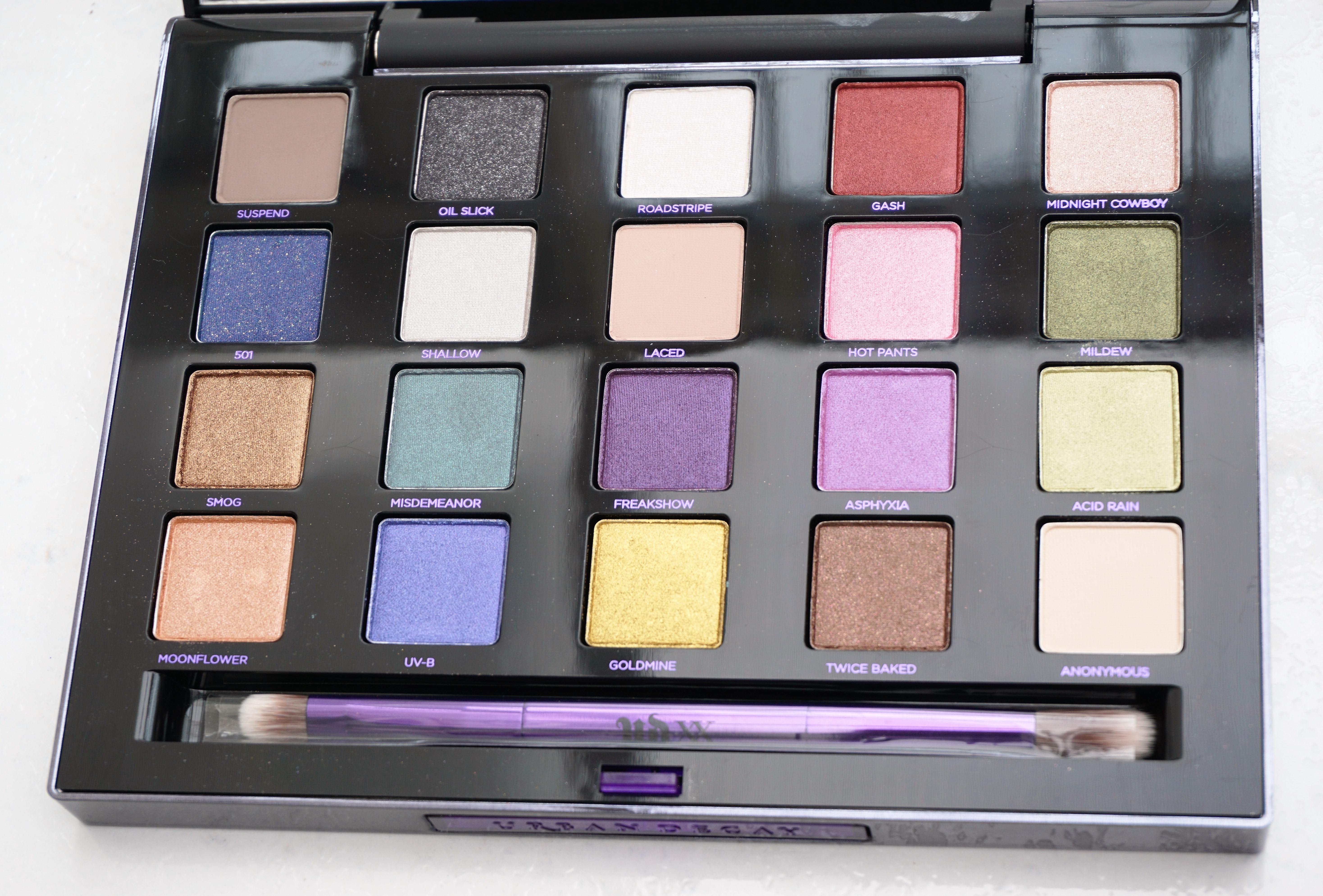 The palette itself is black all over, with purple lettering on the front and back. The front of the palette has the Urban Decay slogan in purple jewelled letters and the name of the palette underneath in purple letters. The back of the palette has the Urban Decay slogan, name of the palette and distribution information printed in purple.