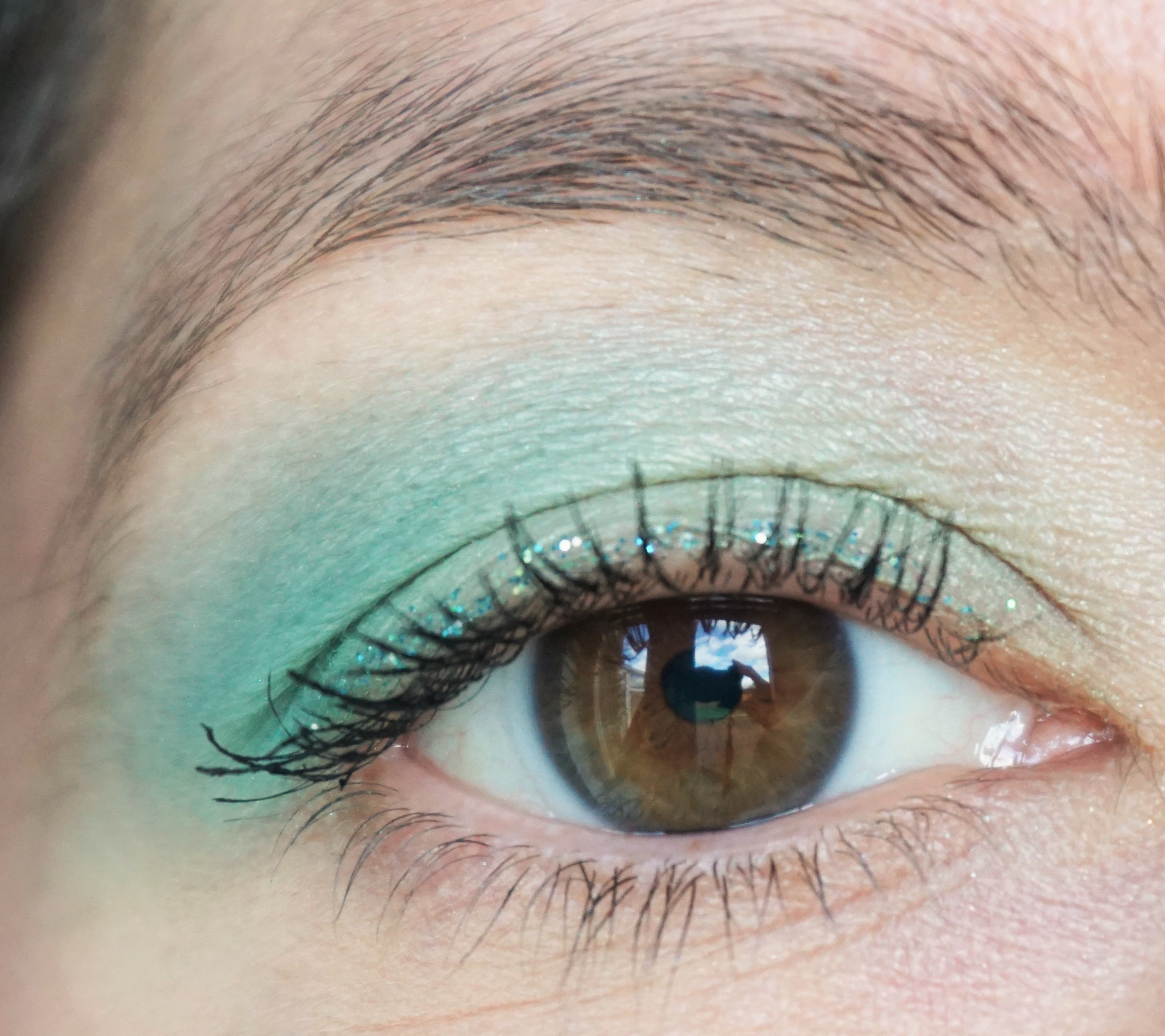 For this look, I added a slick of a glitter liner (Urban Decay Heavy Metal Glitter Eyeliner in Amp) along the lashline to add some sparkle to this aqua-green combination. I really like the glitter liner adds a little extra something to the look, without changing it too much.