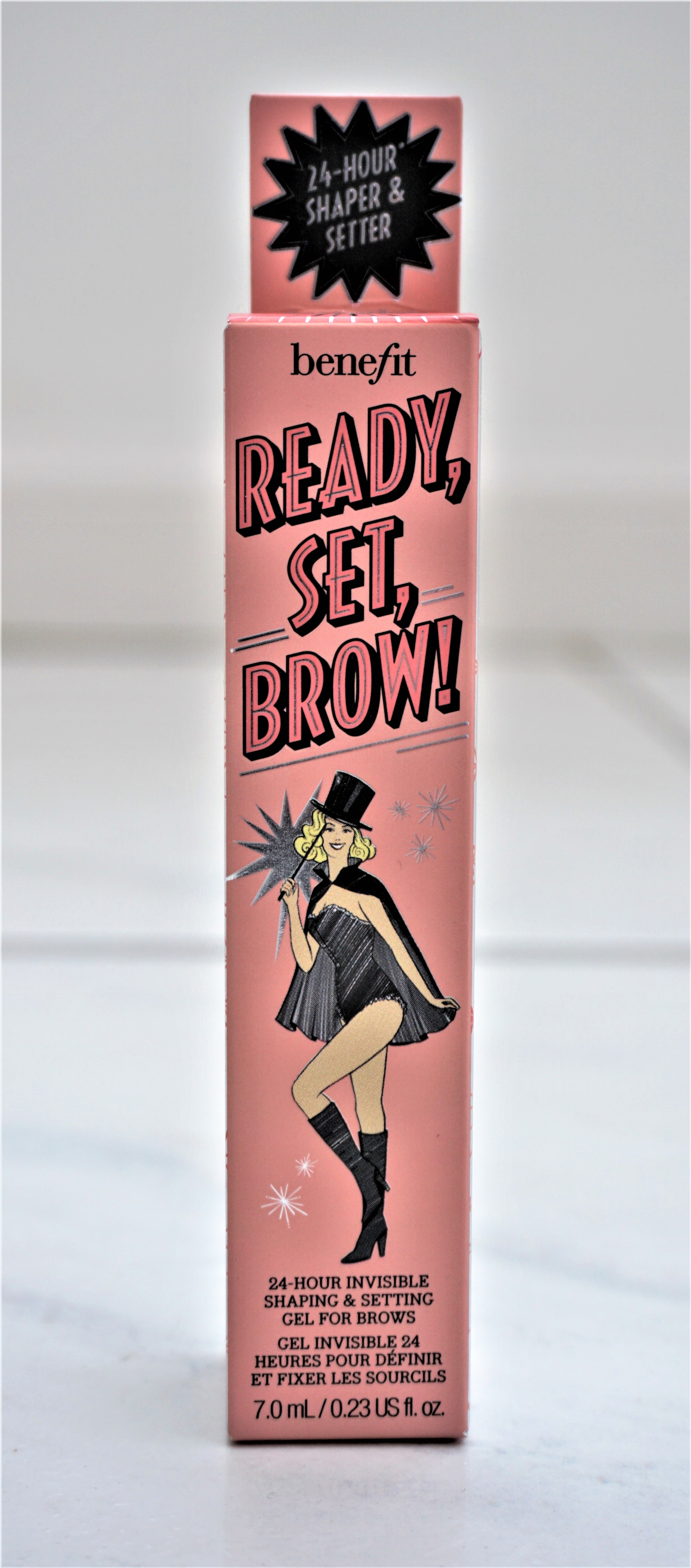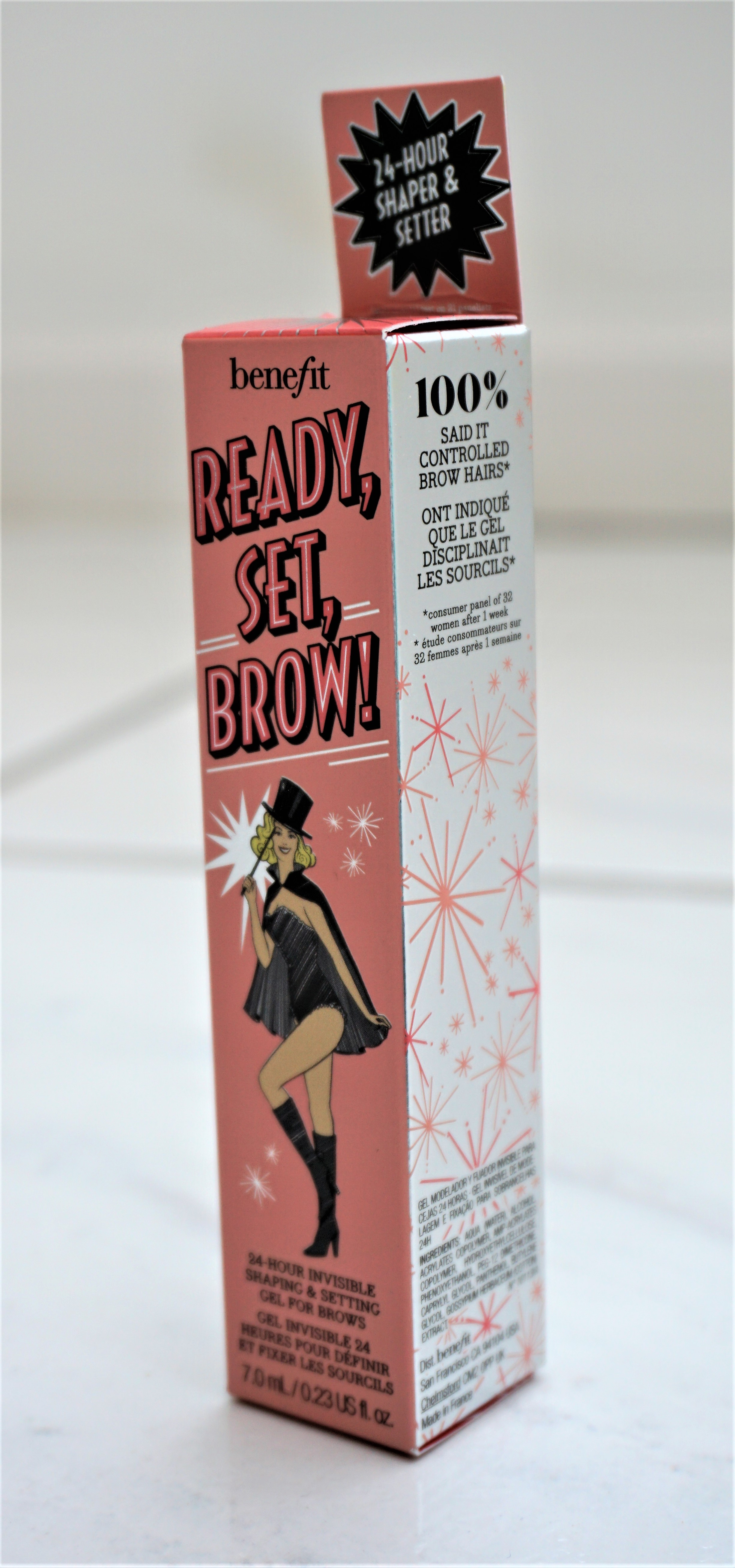 Ready, Set, Brow! comes beautifully packaged in a pink and silver box. The front of the box provides the product information, including the name, purpose, weight and how to use the product. It states that Ready, Set, Brow! is a ’24 hour invisible shaping and setting gel for brows’ and that the container holds 7.0ml/0.23 US fl.oz of product. The side of the box provides some information on how many consumers stated the brow gel held their brows in place.