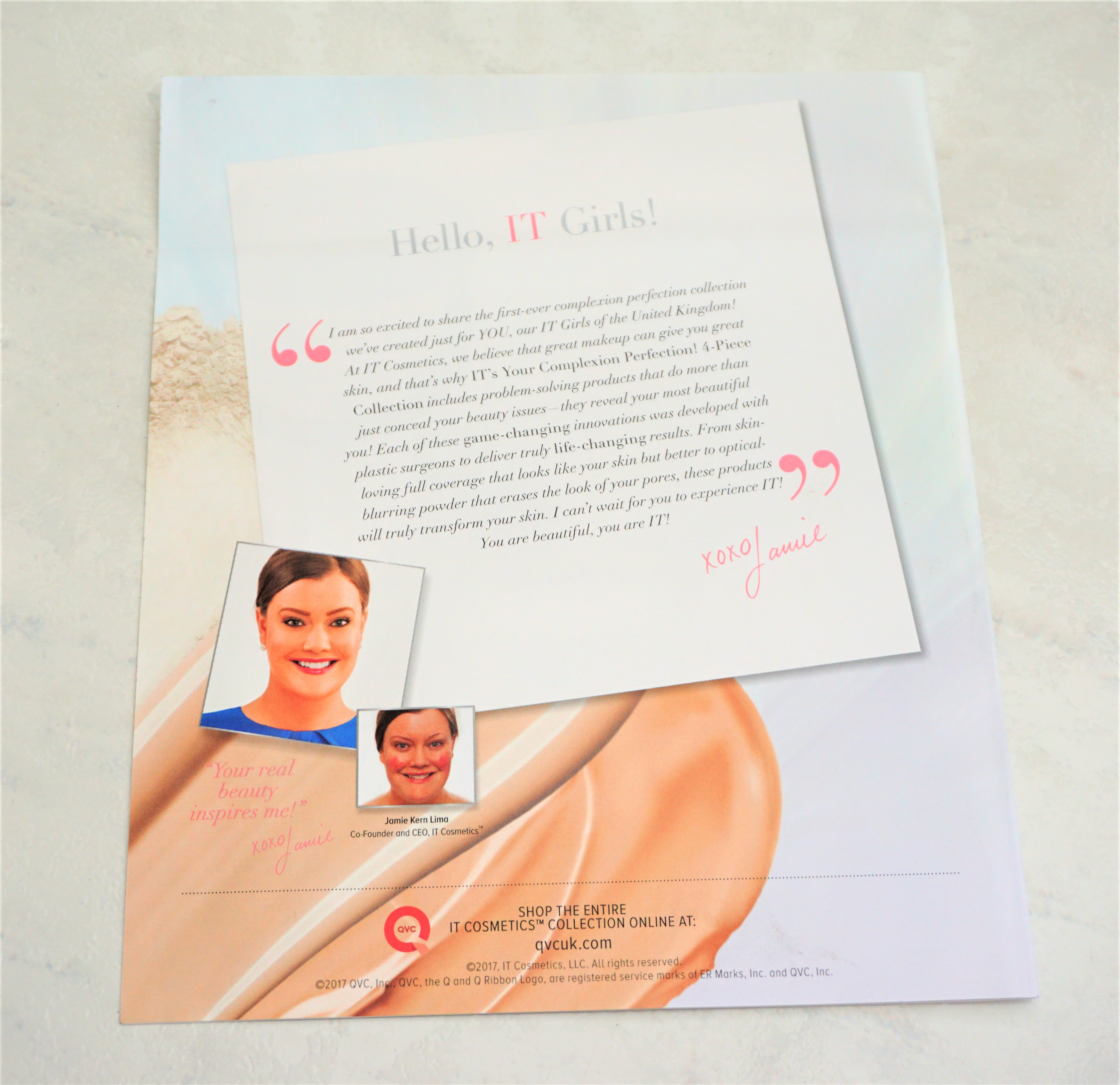 The back of the leaflet has a statement from the IT Cosmetics creator, Jamie Kern Lima. It provides some general information on the products which are included in the collection.