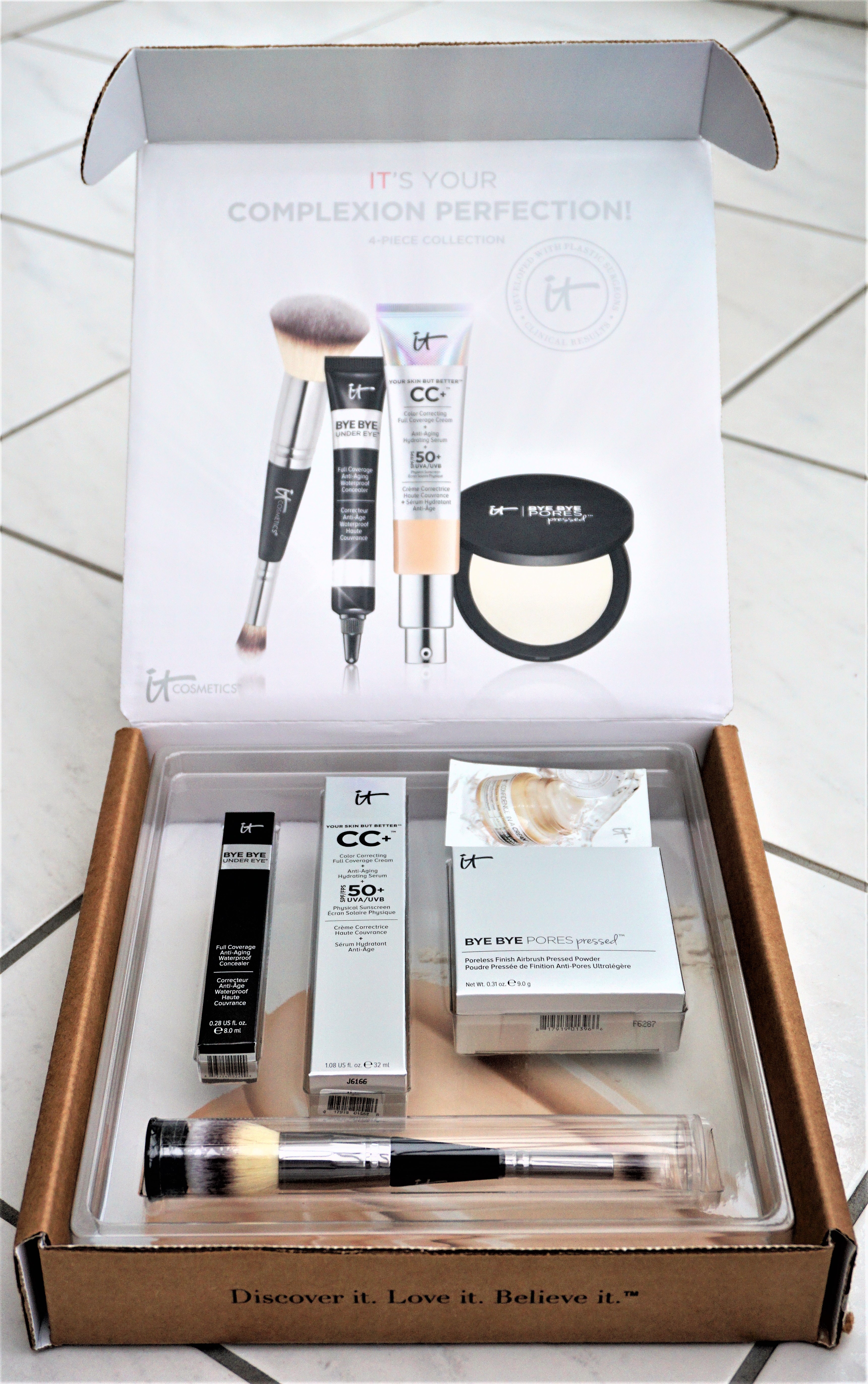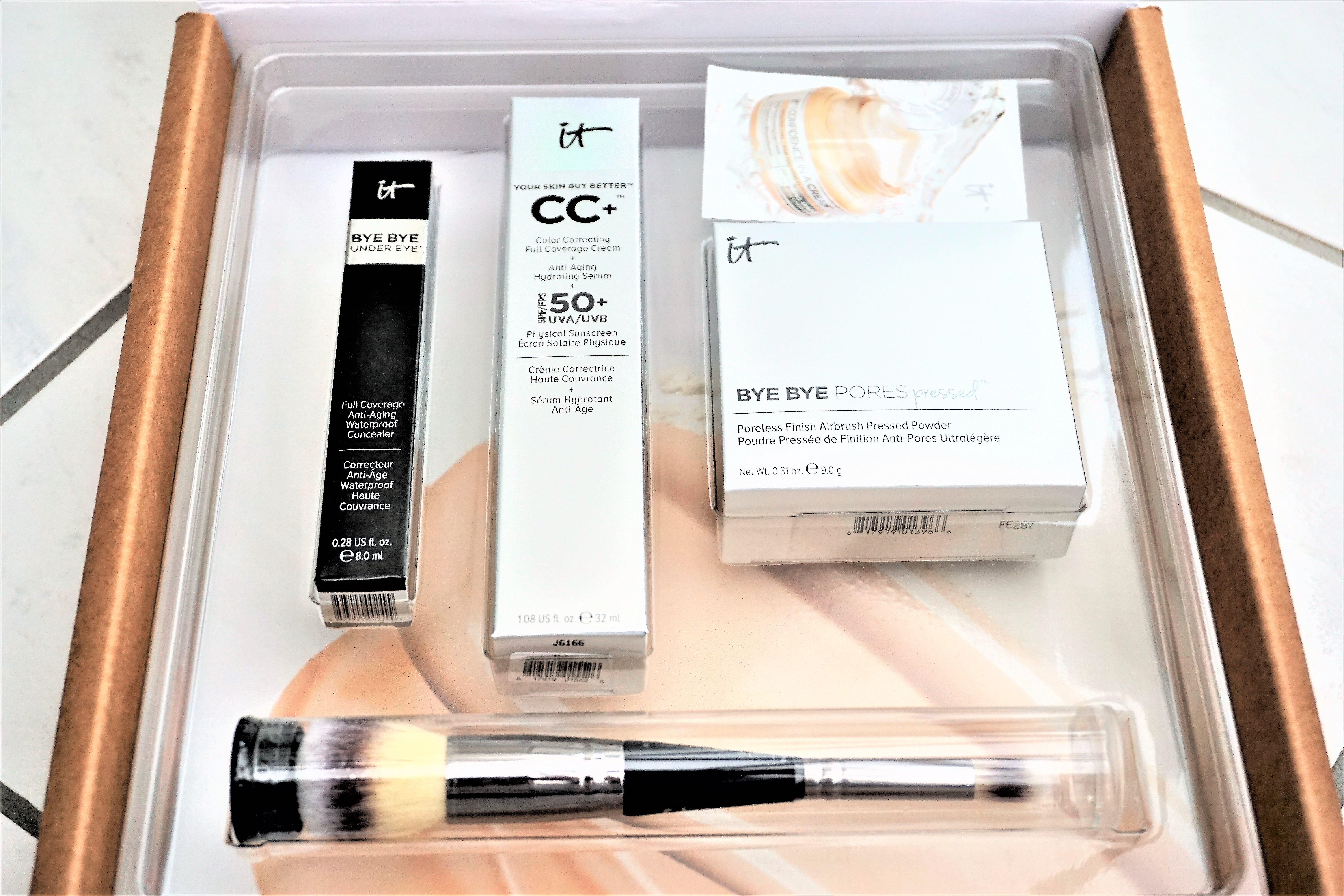 The top part of the box has a picture of the products inside. The box contains the Your Skin But Better CC+ Cream, the Bye Bye Under Eye Concealer, Bye Bye Pores Pressed Powder and a double-ended Heavenly Luxe Complexion Perfection Brush. There is also a sachet sample of the IT Cosmetics Confidence in a Cream.