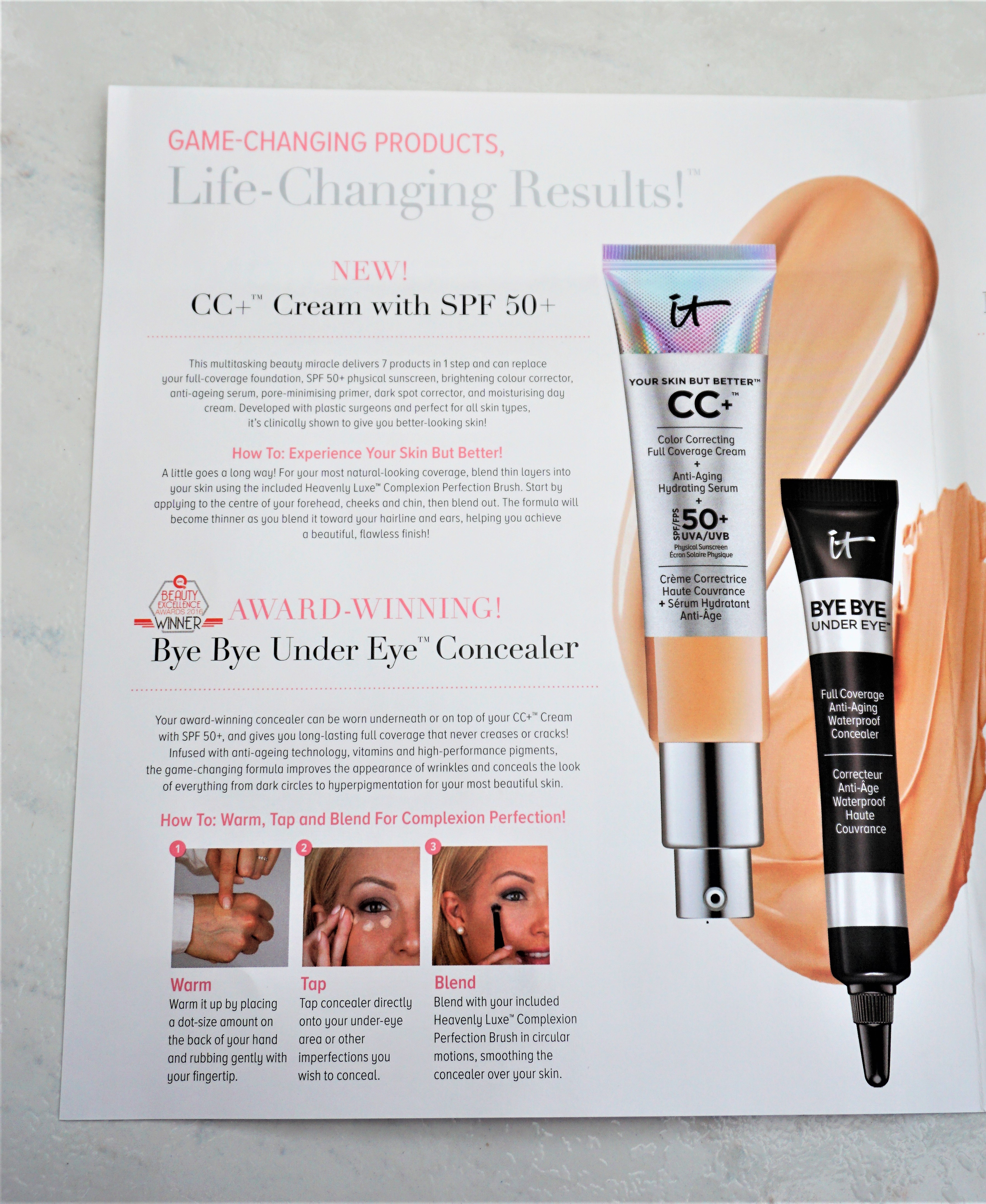 There is a leaflet on top of the items which provides more information on IT Cosmetics and also explains how to use the products.