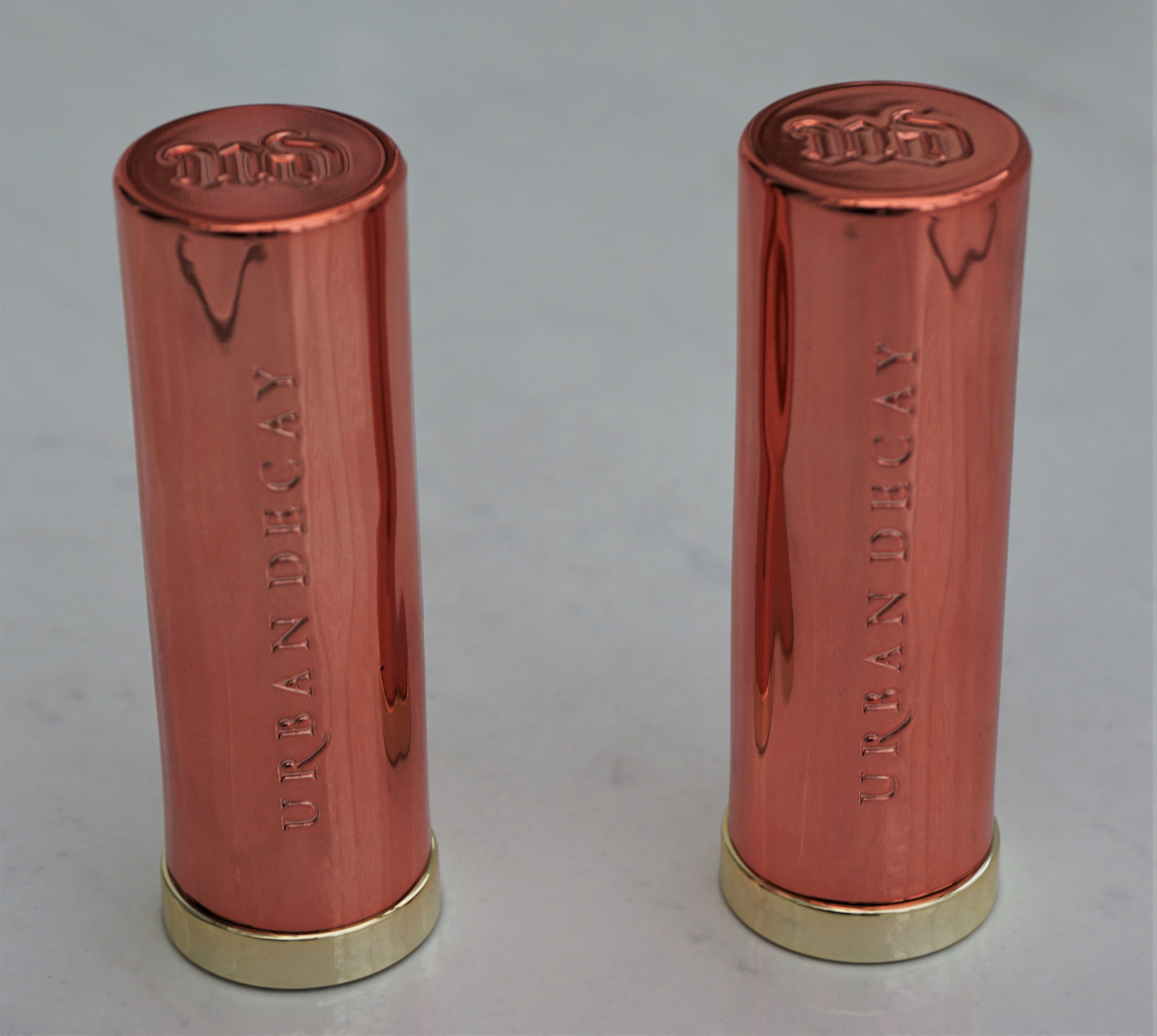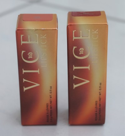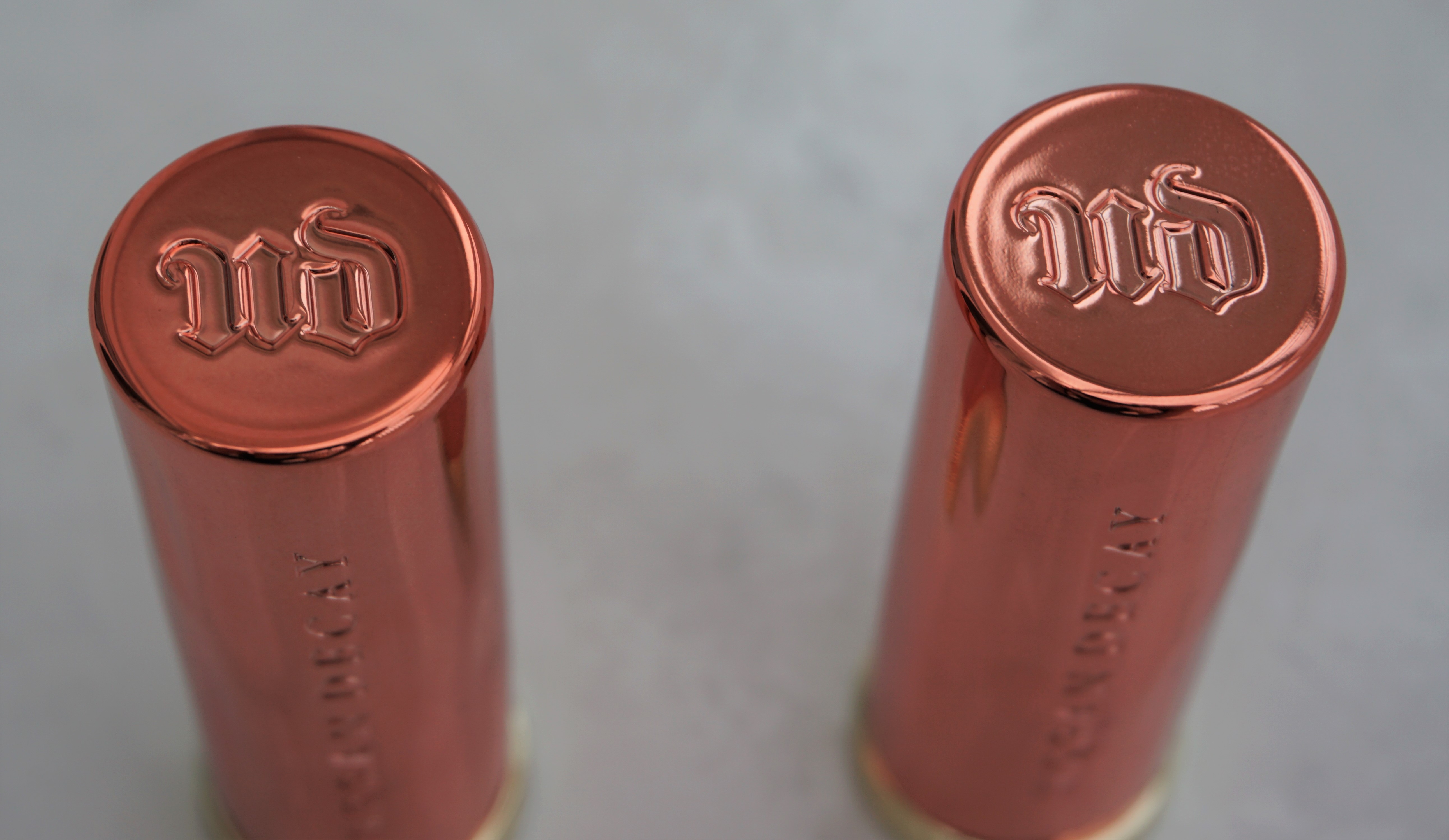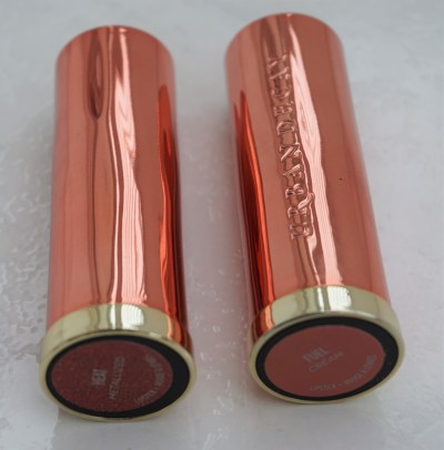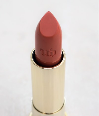The lipsticks come packaged in tubes which are similar design-wise to the permanent Vice lipsticks but with an alternative colour scheme. The Naked Heat lipsticks have copper lids and gold bases to tie in with the Naked Heat theme and the outer boxes. The copper lids have ‘Urban Decay’ printed on the side and the ‘UD’ logo inscribed on the tops.