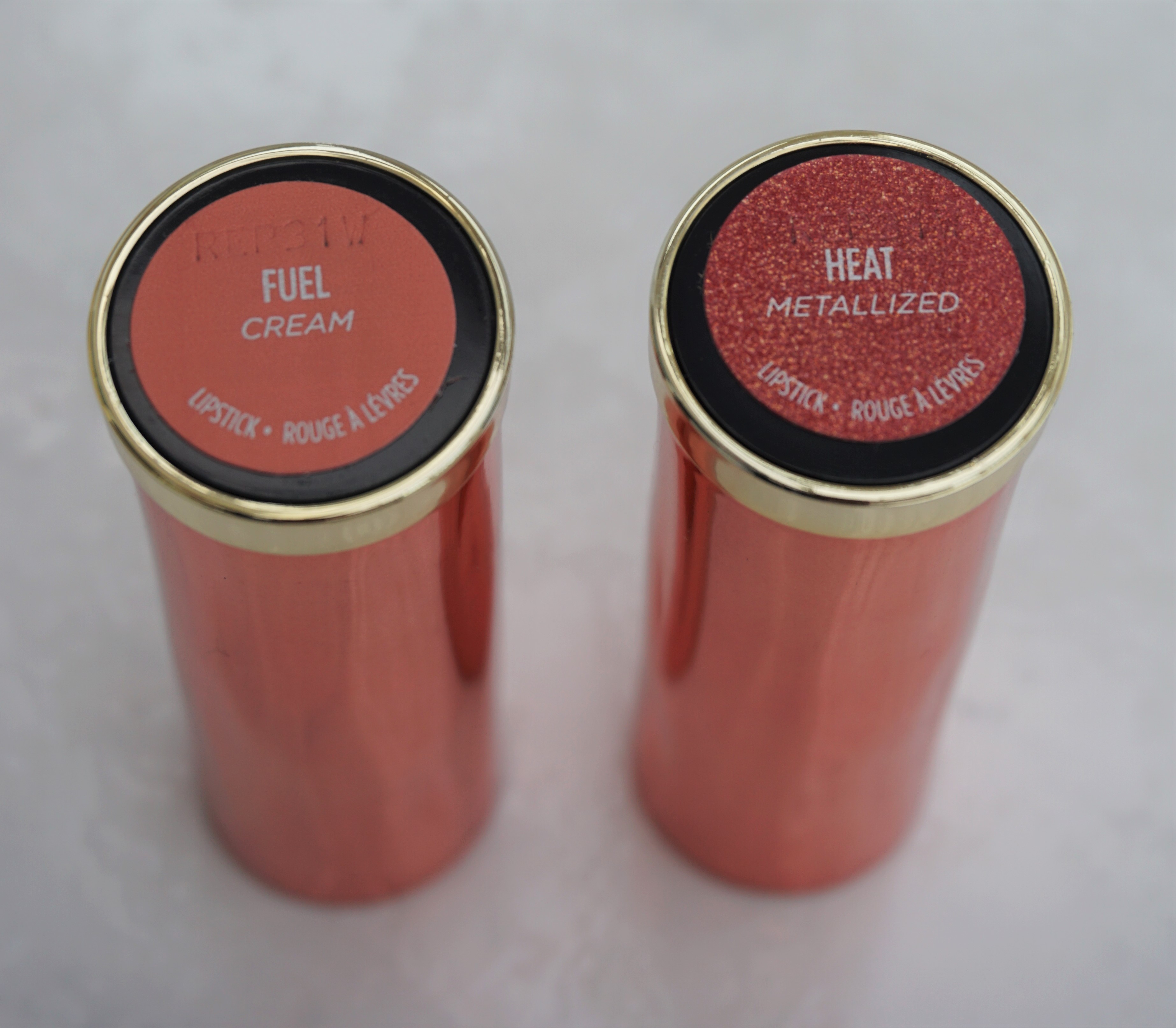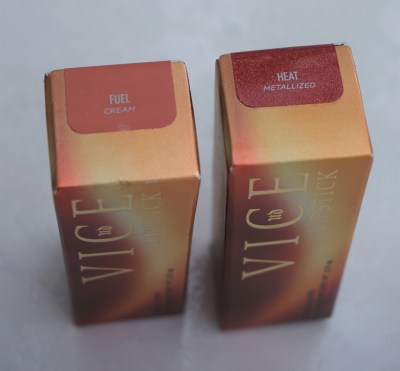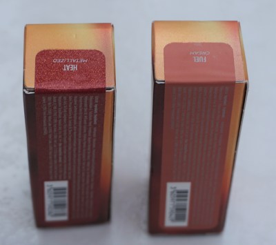 The lipsticks come in chrome coloured tubes with gold bases. The initials ‘UD’ are inscribed on the lipstick bullets, whilst the brand name is printed along the long edge of the lipstick tubes. I picked up two out of the three shades from the Naked Neat collection: Fuel (Cream finish) and Heat (Metallized finish). There is also a third shade called ‘Scorched (a metallized copper) available in the collection.