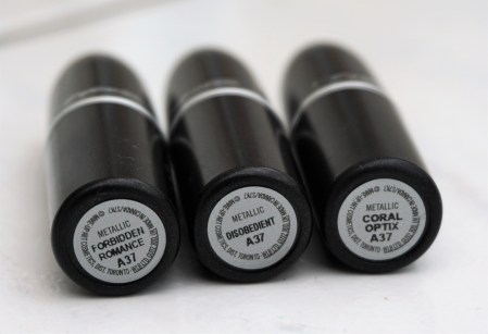 Metallic make-up is big this season and lips are no exception. MAC recently released limited edition Metallic finish lipsticks as part of their lipstick range. I chose three shades – Forbidden Romance, Disobedient and Coral Optix – as I found them flattering and totally different from anything else that I have in my make-up collection.