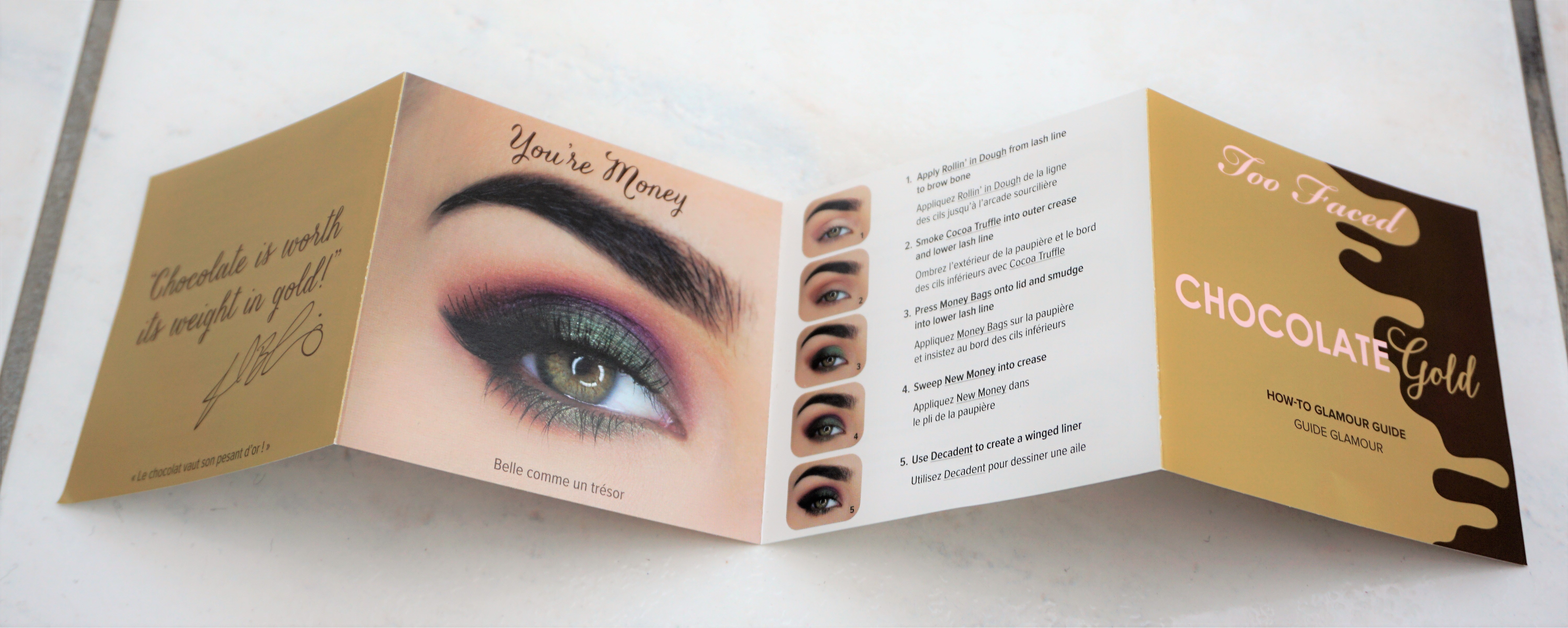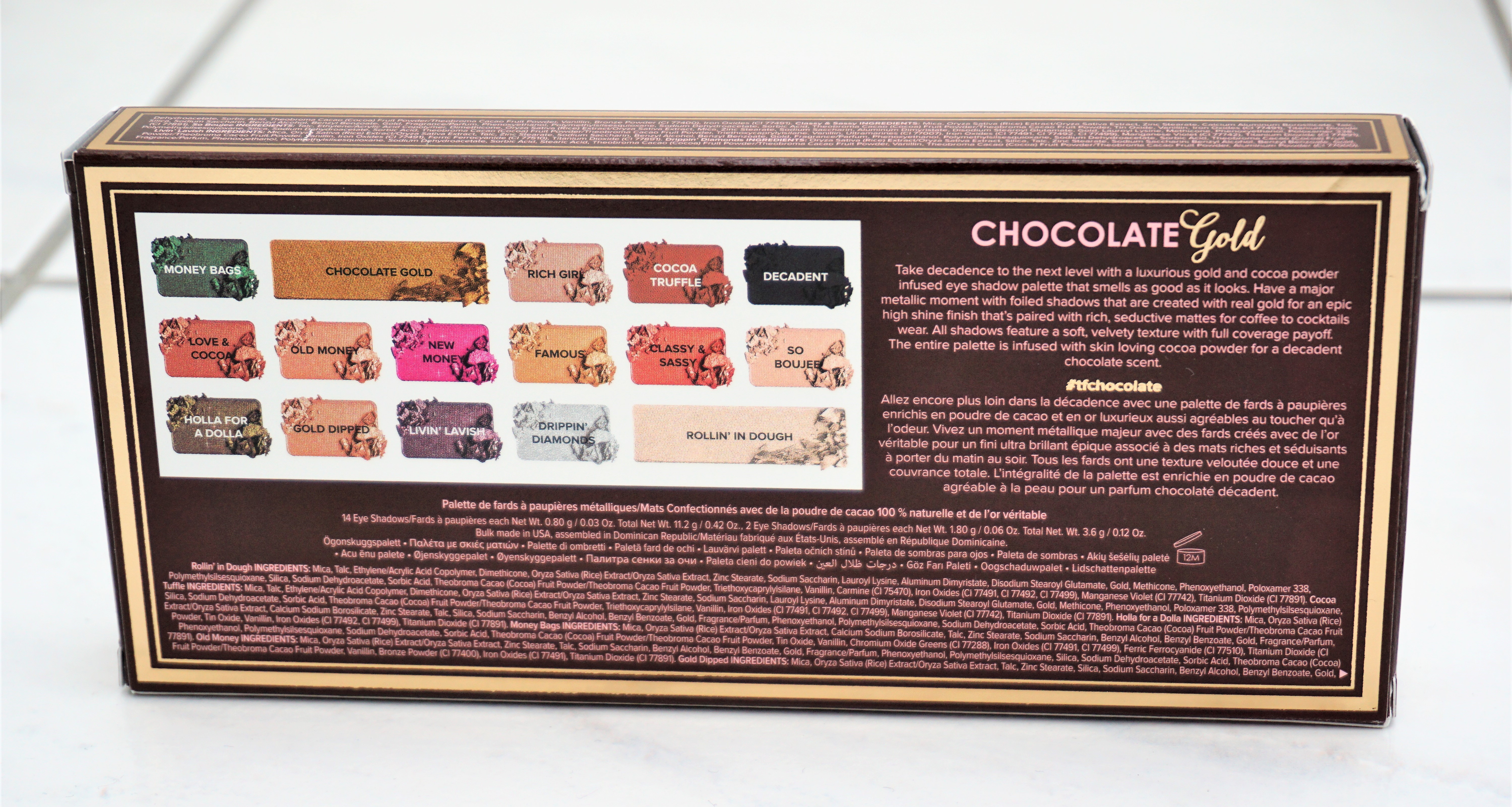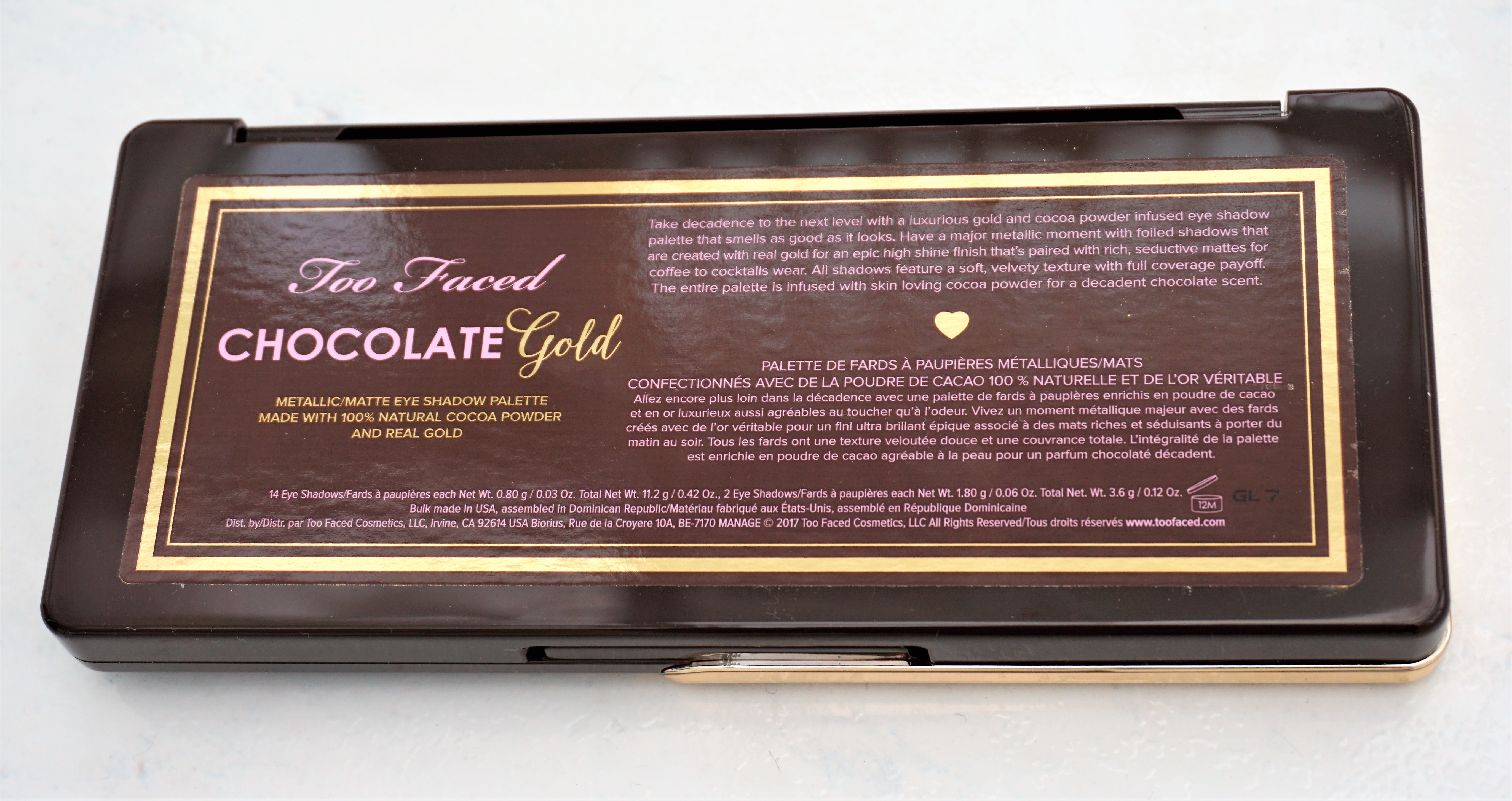 The front says that the palette is a ‘metallic/matte eyeshadow palette made with 100% natural cocoa powder and real gold’. It’s funny thinking that the palette has real gold in it. The cocoa powder aspect is a feature of all of the Too Faced chocolate products and provides a decadent chocolate scent (more on that below).