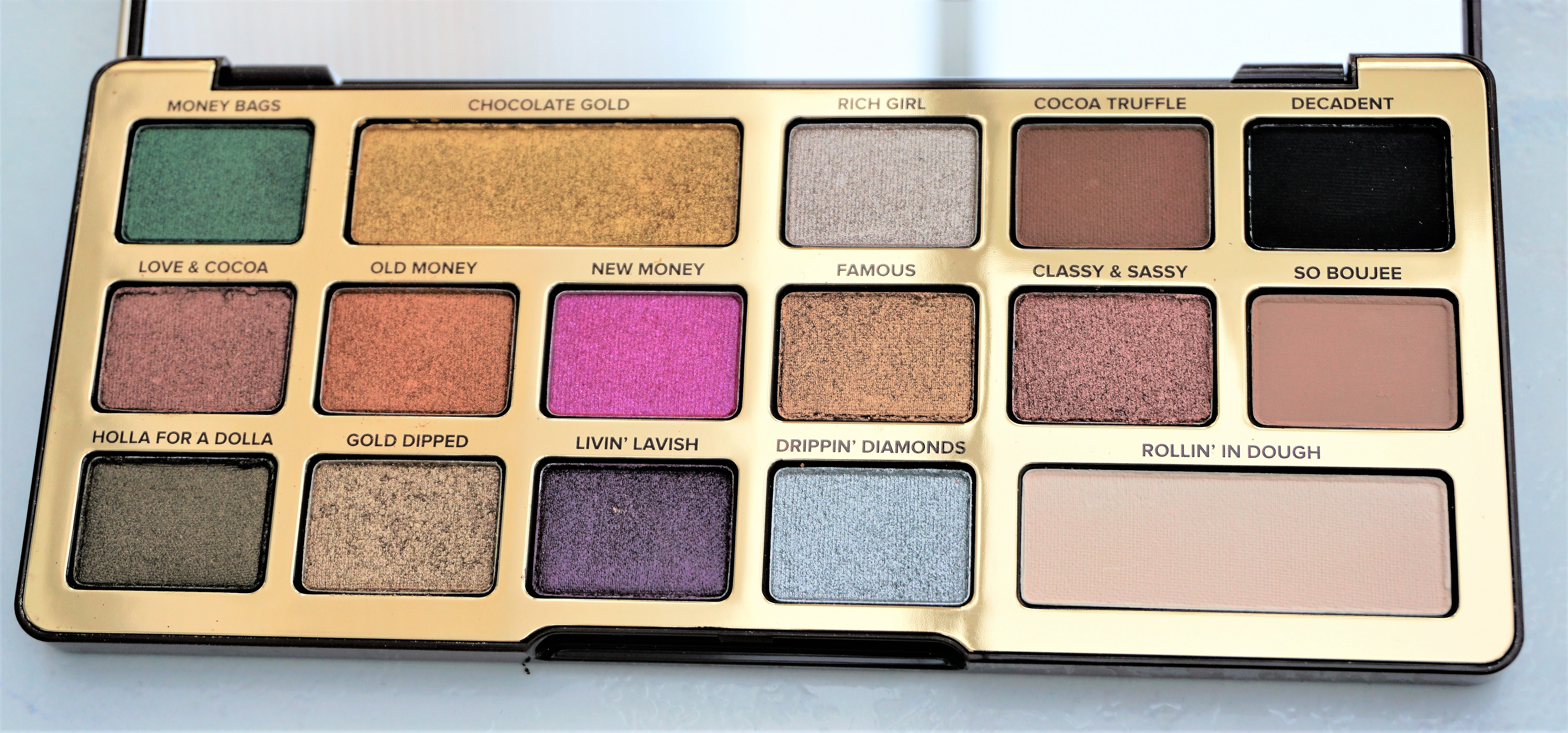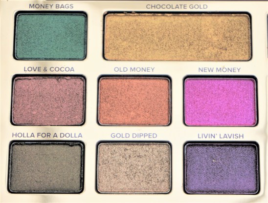 Left to Right (left hand side of the palette): Money Bags, Chocolate Gold, Love & Cocoa, Old Money, New Money, Holla For A Dolla, Gold Dipped, Livin’ Lavish