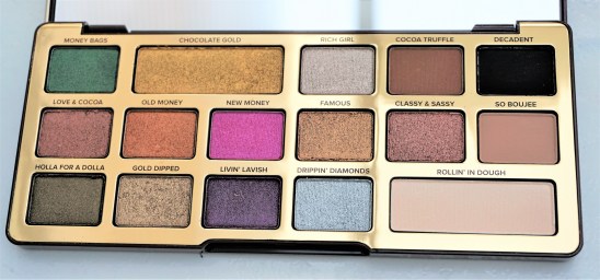 Left side of palette: Money Bags, Chocolate Gold (top row), Love&Cocoa, Old Money, New Money (middle row), Holla For A Dolla, Gold Dipped, Livin’ Lavish (bottom row)