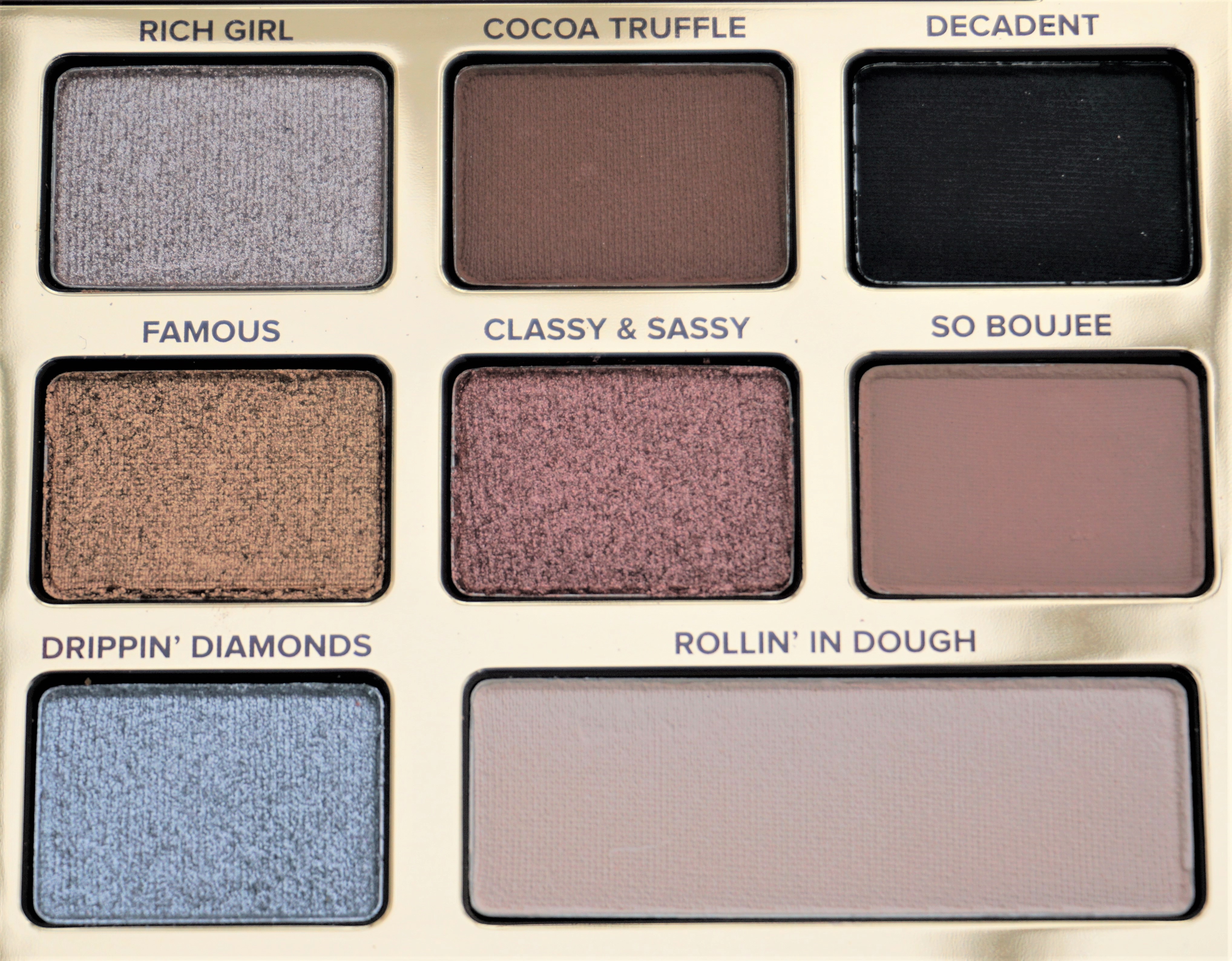 Right Side of Palette: Rich Girl, Cocoa Truffle, Decadent (top row), Famous, Classy & Sassy, So Boujee (middle row), Drippin’ Diamonds, Rollin’ in Dough (bottom row)