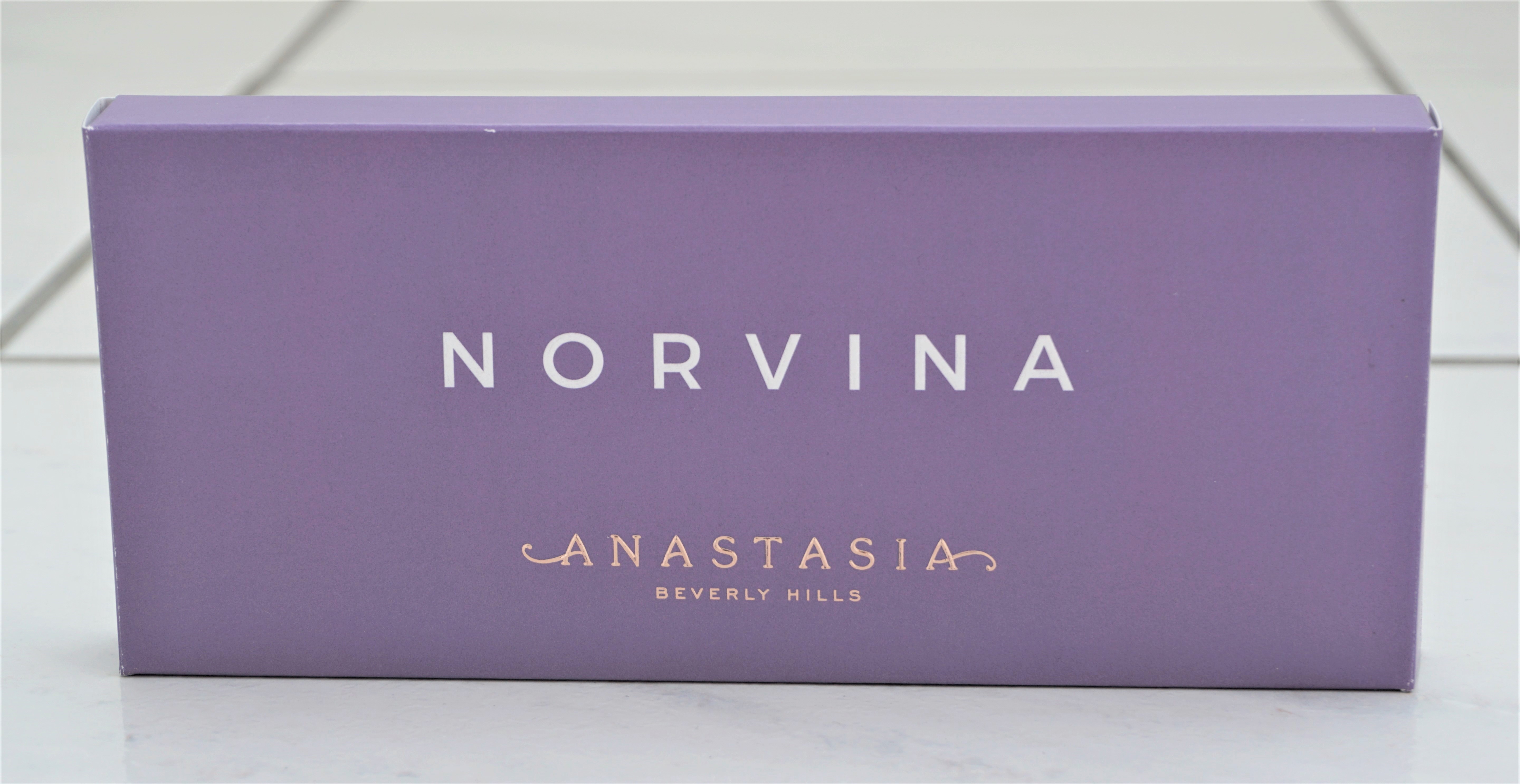 The Norvina Palette comes packaged in a sleek, rectangular lavender purple box. The front of the box has the palette name – Norvina – in white and the brand name in gold lettering.