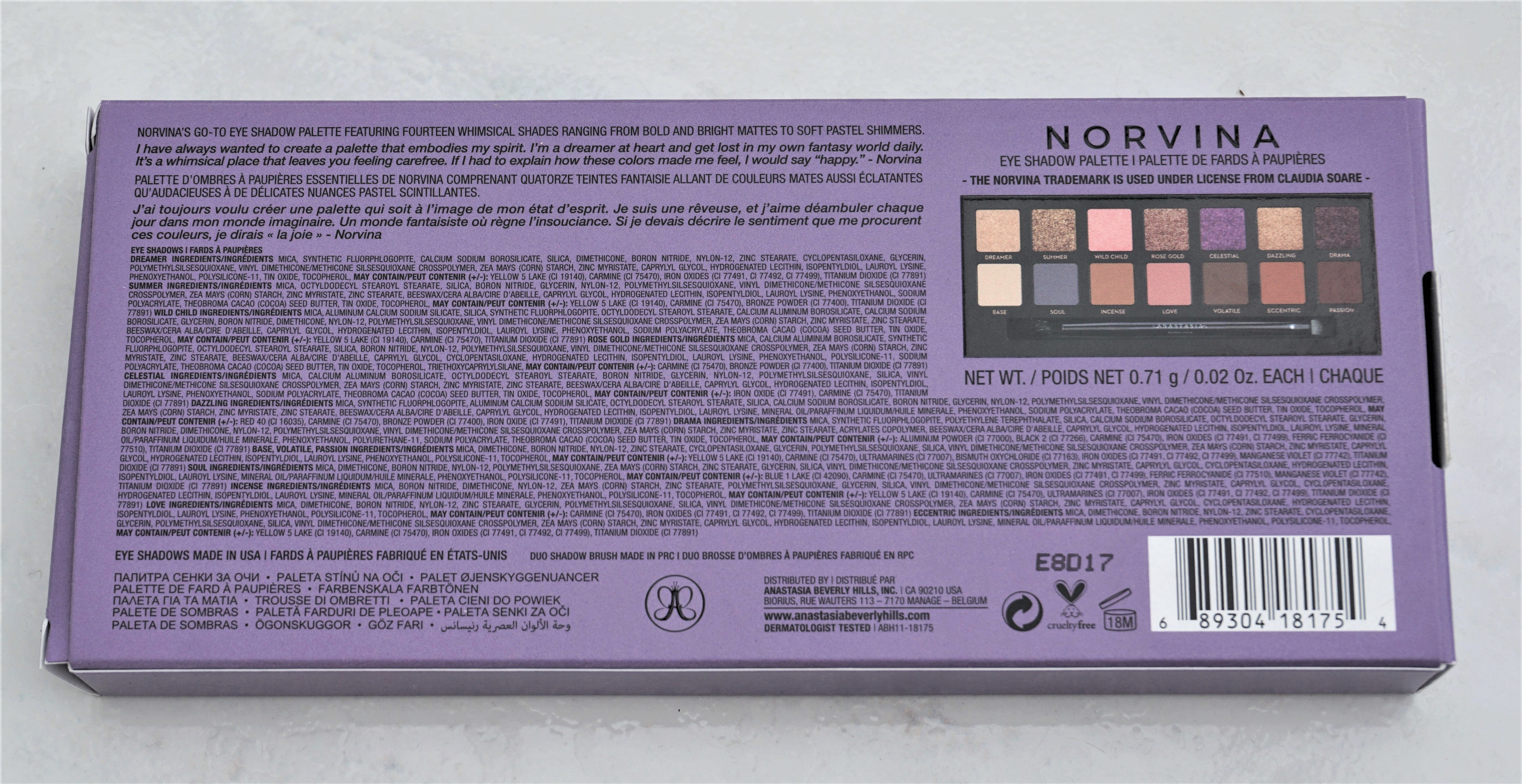 The box states that each eyeshadow has a net weight of 0.71g/0.02oz. The ingredients list and distribution information are also printed on the box. The box says that the palette is “Norvina’s go to eyeshadow palette featuring fourteen whimsical shades ranging from bold and bright mattes to soft pastel shimmers”.