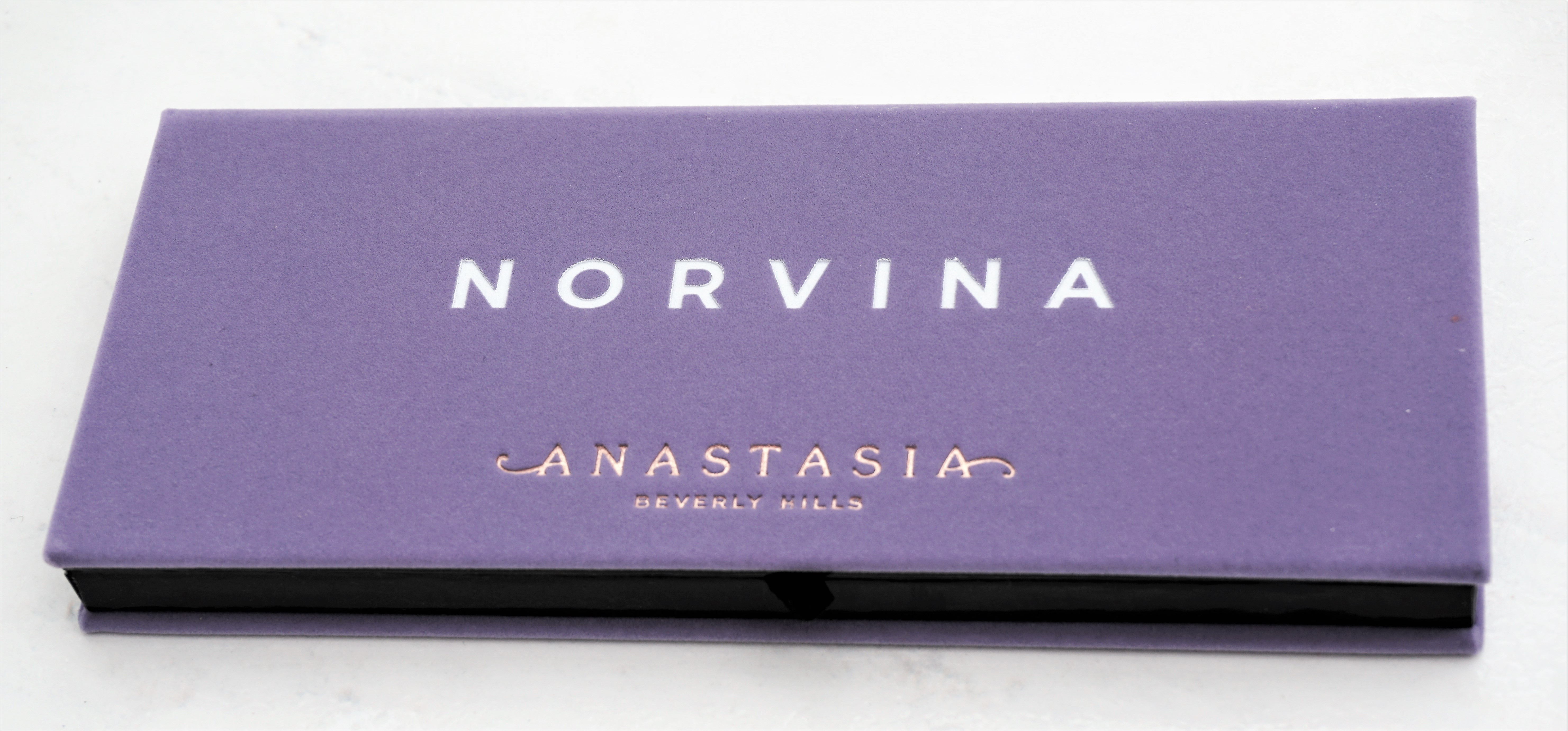 The Norvina Palette comes in a sleek, rectangular rectangular purple packaging, with a soft, velvet like finish. The front of the palette mimics the outer packaging, with ‘Norvina’ printed in white lettering and the brand name in gold.