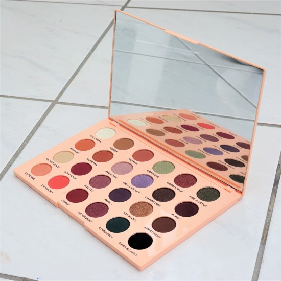 The palette comes in a sleek, rectangular, peachy-beige box. The palette is pretty big, as it contains 24 eyeshadows. The front of the box provides the brand, palette name and contents in shiny rose gold writing. Emily’s signature is printed on the front as part of the collaboration (The Emily Edit). The net weight of the products inside is also printed on the front of the box (24 eyeshadows x 0.03oz/0.85g).