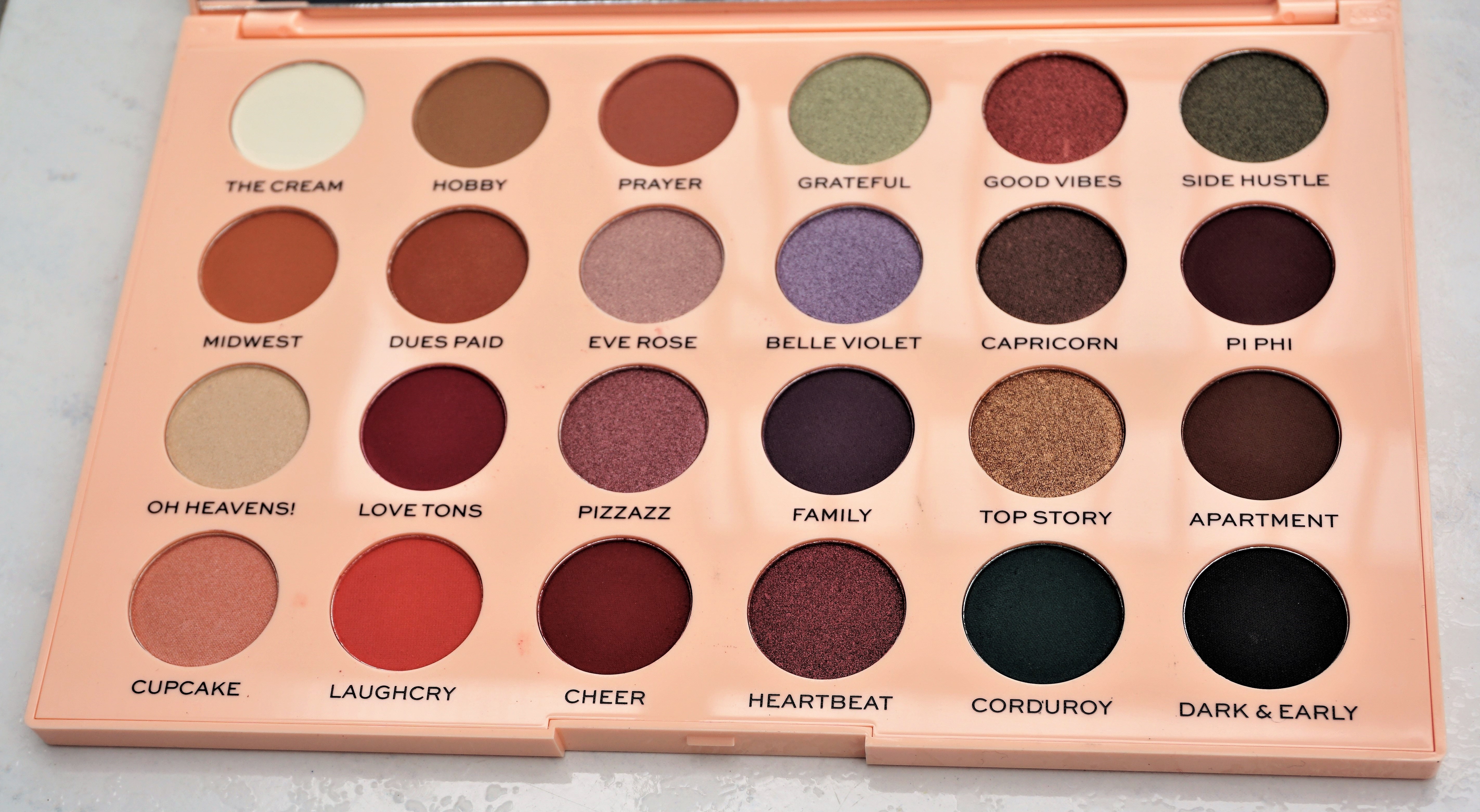 Another aspect I really love about the palette is that the tones span across colour spectrums. This means that you get light, medium and dark variations on particular colour families, as well as warm and cool tones. For example, there are three greens included – Grateful (light shimmery green), Side Hustle (shimmery khaki green) and Corduroy (deep matte green). Cooler purples like Belle Violet (a shimmery lavender) and Family, a deep matte purple are also balanced out by warmer purples, including Pizazz (a medium maroon purple and Pi Phi (a deep matte plum-purple). Palettes often just contain one of particular type of colour, so it is amazing to get variations within a colour family, as well as warm and cooler tones.