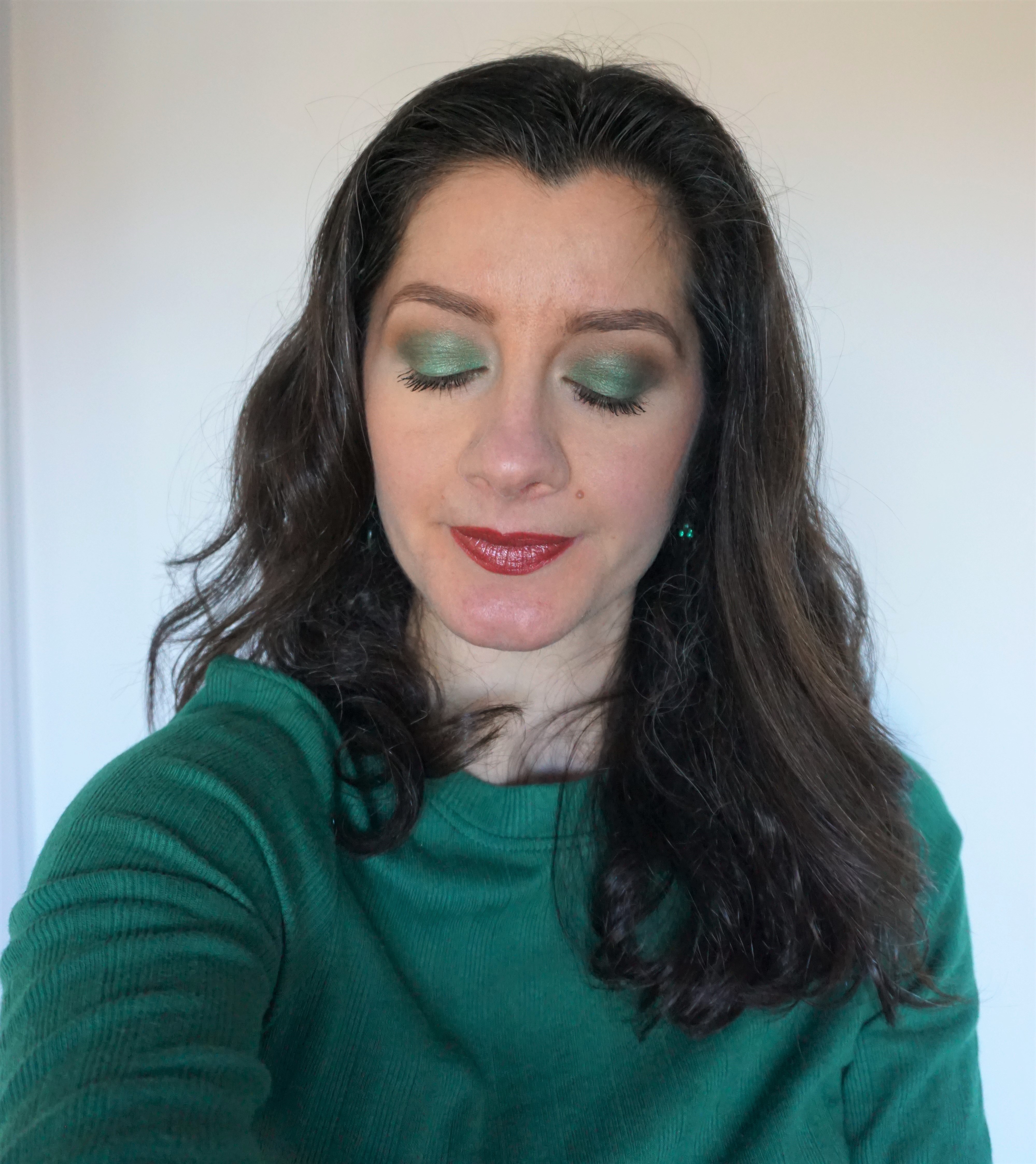 For this look, I used a bright jewel green eyeshadow on the lid to create a jewelled emerald effect on the eyes.