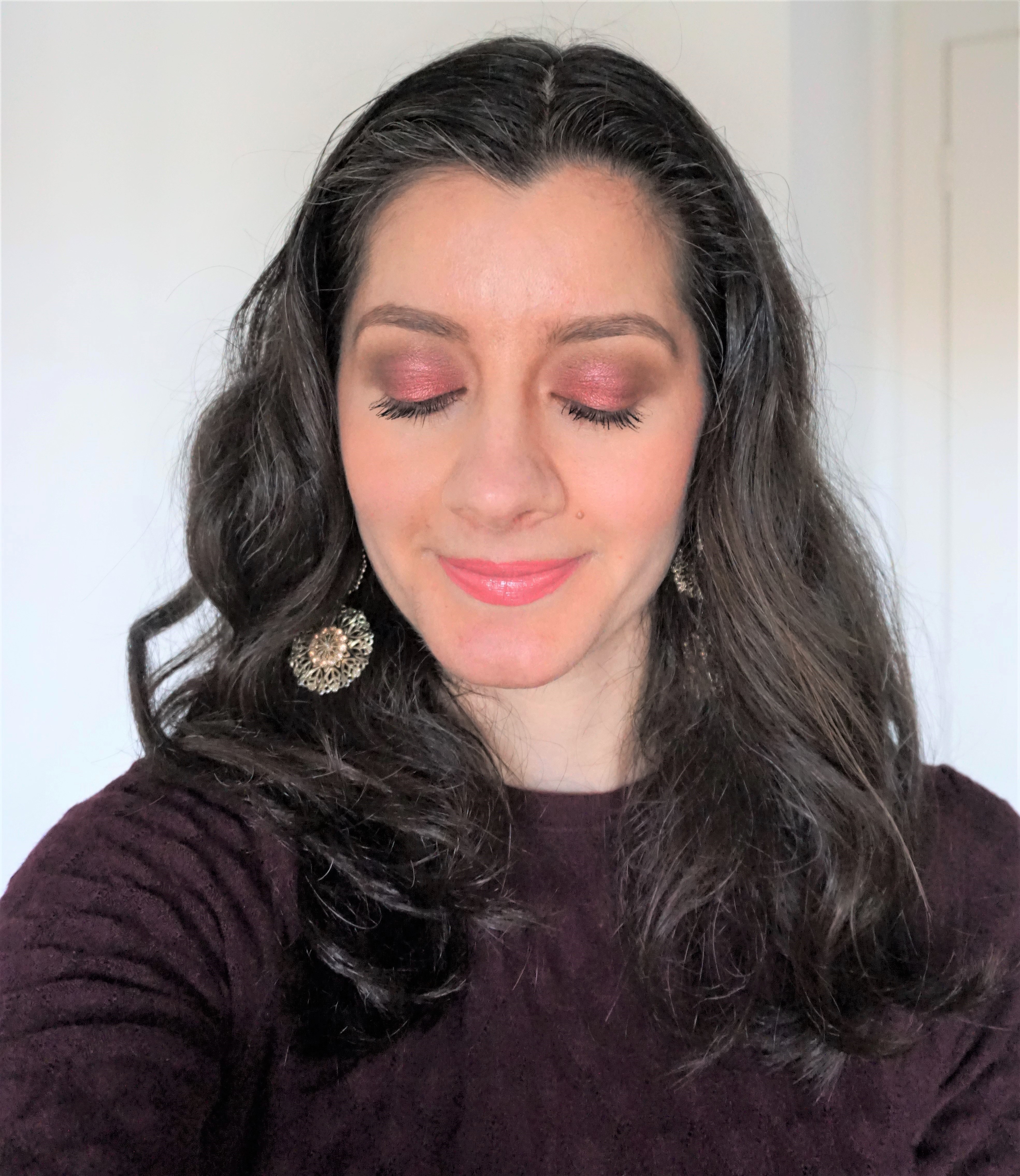 For this look, I used a bright cherry-cranberry eyeshadow on the lid to create a warm cranberry effect on the eyes.