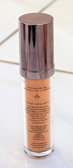 The Urban Decay Naked Skin Foundation comes in a long, cylindrical plastic bottle, with a clear base showing the foundation shade through it and a pewtered coloured lid. The bottle has a reasonable weight to it, without being too heavy. The bottle has the same information printed on it as the outer box, in terms of the brand name, product name and volume.