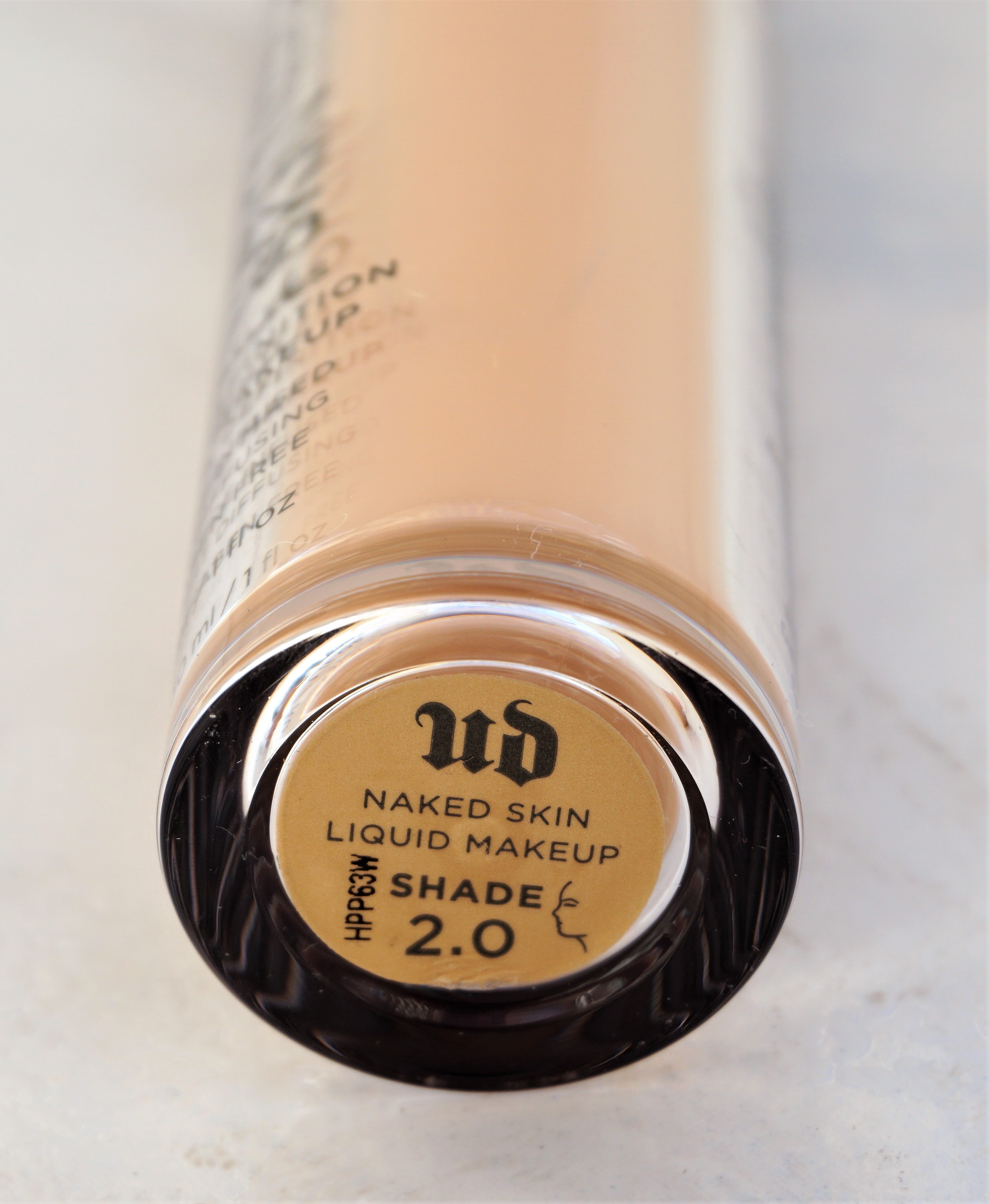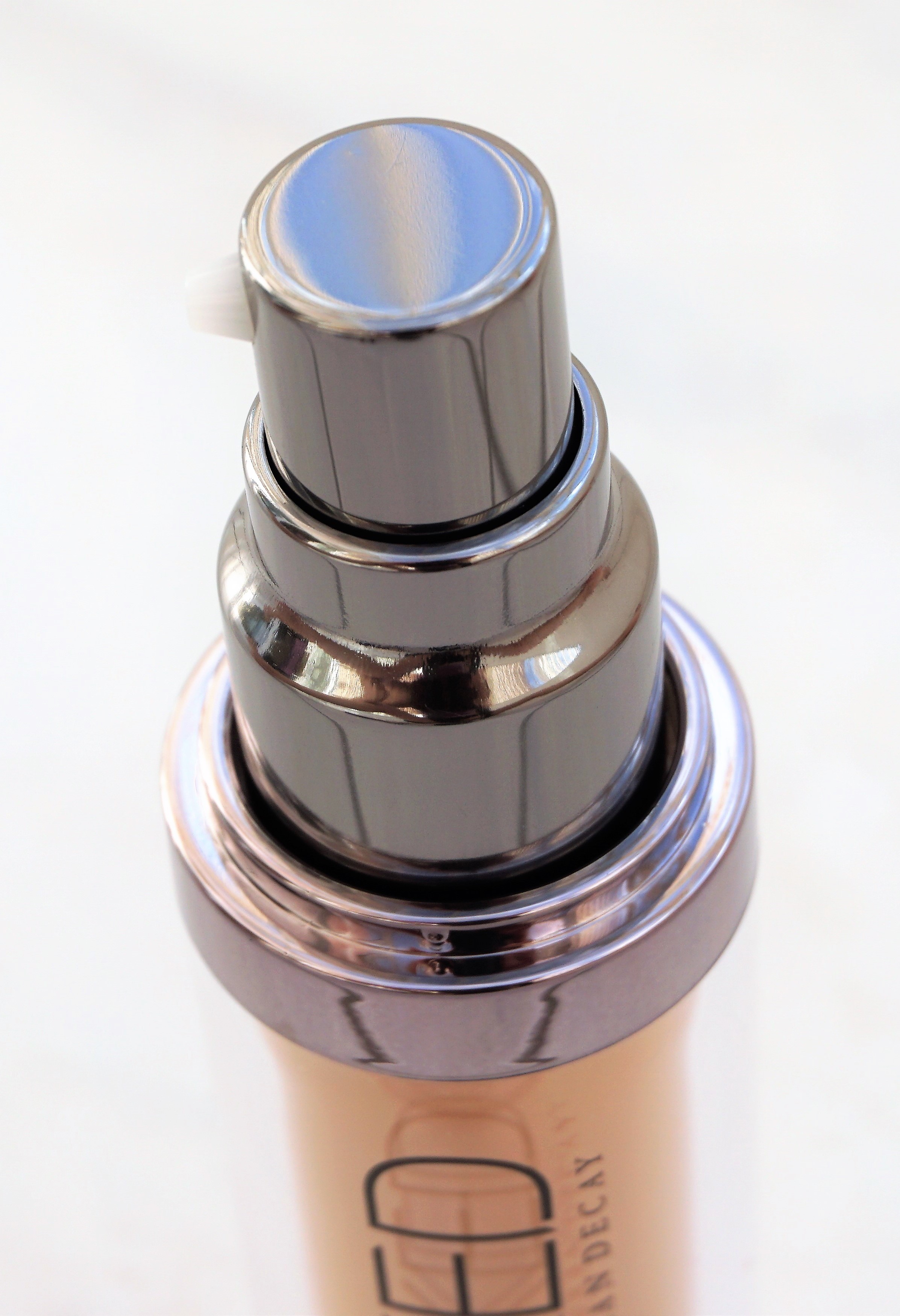 The Urban Decay Naked Skin Foundation comes in a long, cylindrical plastic bottle, with a clear base showing the foundation shade through it and a pewtered coloured lid. The bottle has a reasonable weight to it, without being too heavy. The bottle has the same information printed on it as the outer box, in terms of the brand name, product name and volume.