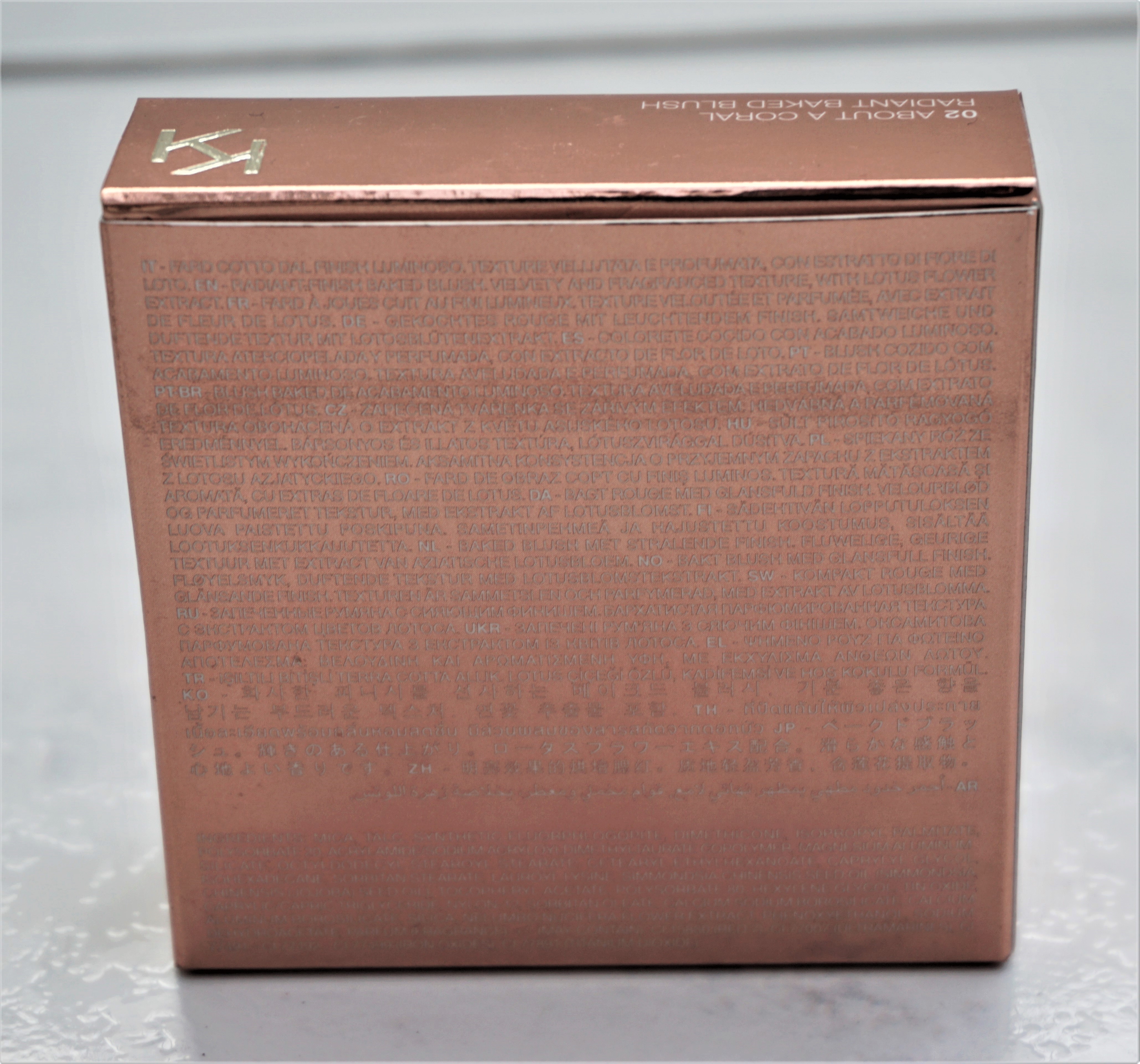 The back of the box provides information in various languages on the product inside, as well as the ingredients. The box states that box contains a “Radiant finish baked blush. Velvety and fragranced texture, with lotus flower extract”.