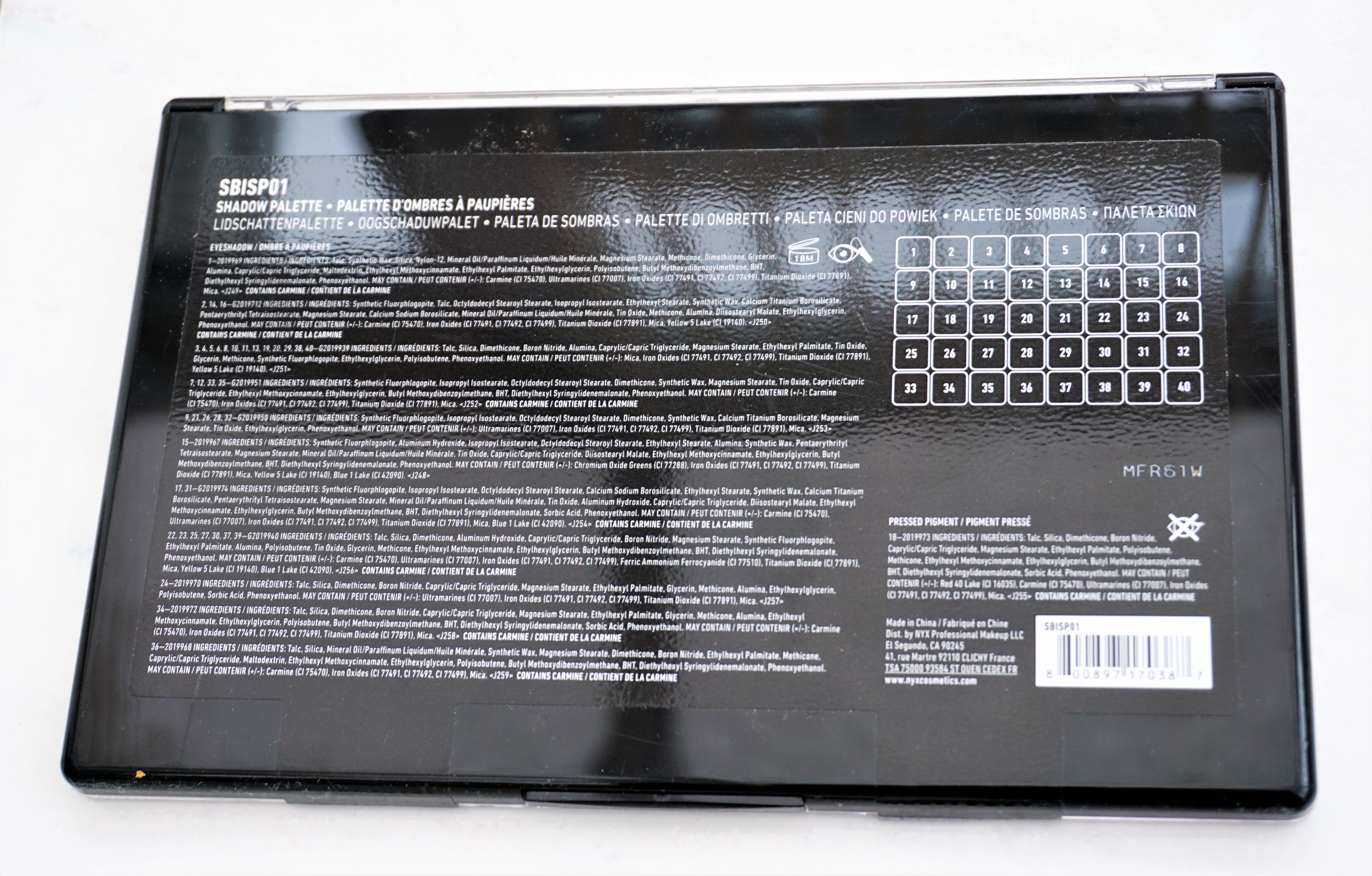 There is a chart on the back top right of the palette giving the eyeshadow shade numbers (see photo above). The actual eyeshadows on the front don’t have any numbers printed underneath them, which means you have to refer to the back of the palette for these.