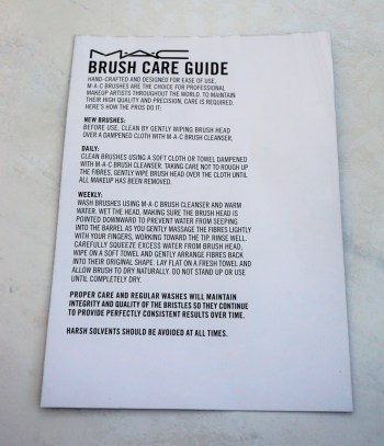 I have used the MAC Brush Cleanser (which is mentioned on the leaflet) in the past and thought it was great for spot cleaning and deep cleaning. However, I have been using baby shampoo to clean my brushes for several years now as it is so much cheaper and I think it does just as good a job. You can’t spot clean with the baby shampoo, though, so brush cleansers are helpful if you want that function as part of your brush cleaning routine.