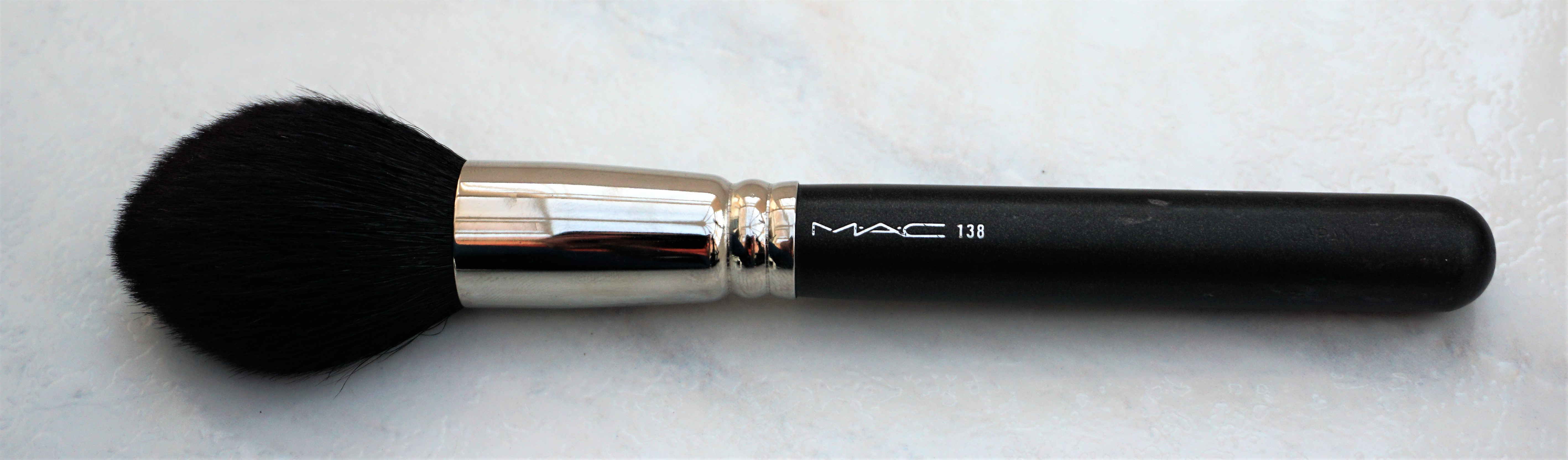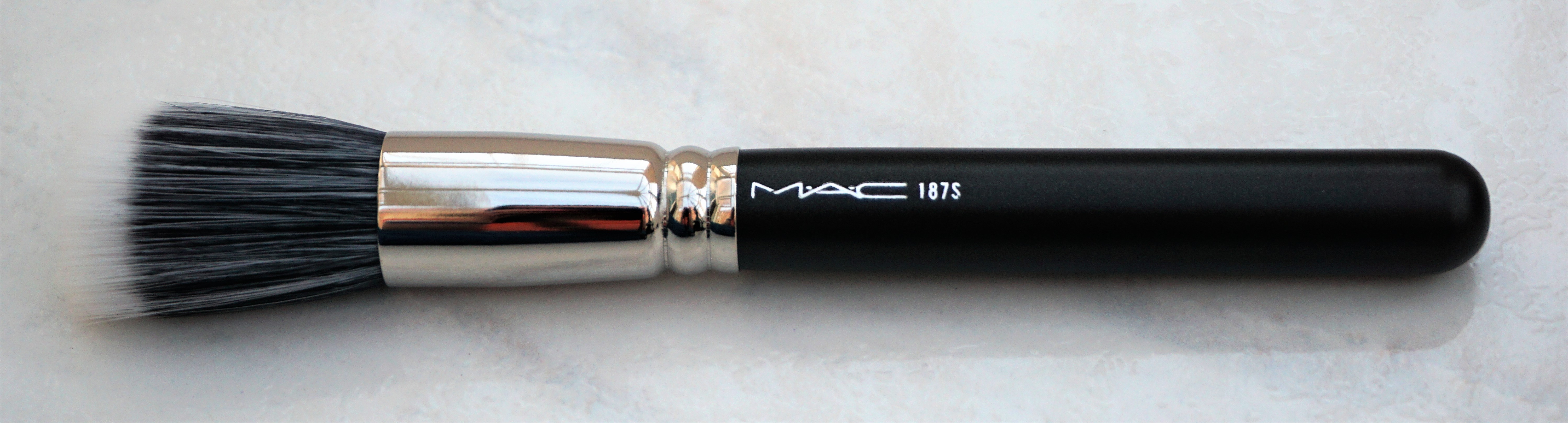 Foundation: Sharyn applied Studio Fix Fluid Foundation to the model’s face. She was going for more of a natural look, so she used a large stippling brush for application (MAC 187S Duo Fibre Face Brush; see photo below). She kept the undereye area free of foundation, as she said she would apply concealer to that area.
