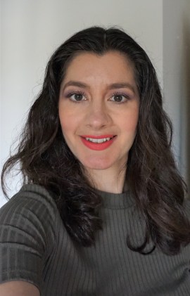 I really love the combination of purple and coral, either in an eyeshadow combination or on the eyes and lips. For this look, I used the Anastasia Beverly Hills Norvina Palette (you can see my post on the palette here) to create a bronze and purple eye. I applied Too Faced Peach Kiss Moisture Matte Long Wear Lipstick in Peach Beach (you can see my post on these lipsticks here) to give a peach-coral finish to the lips.