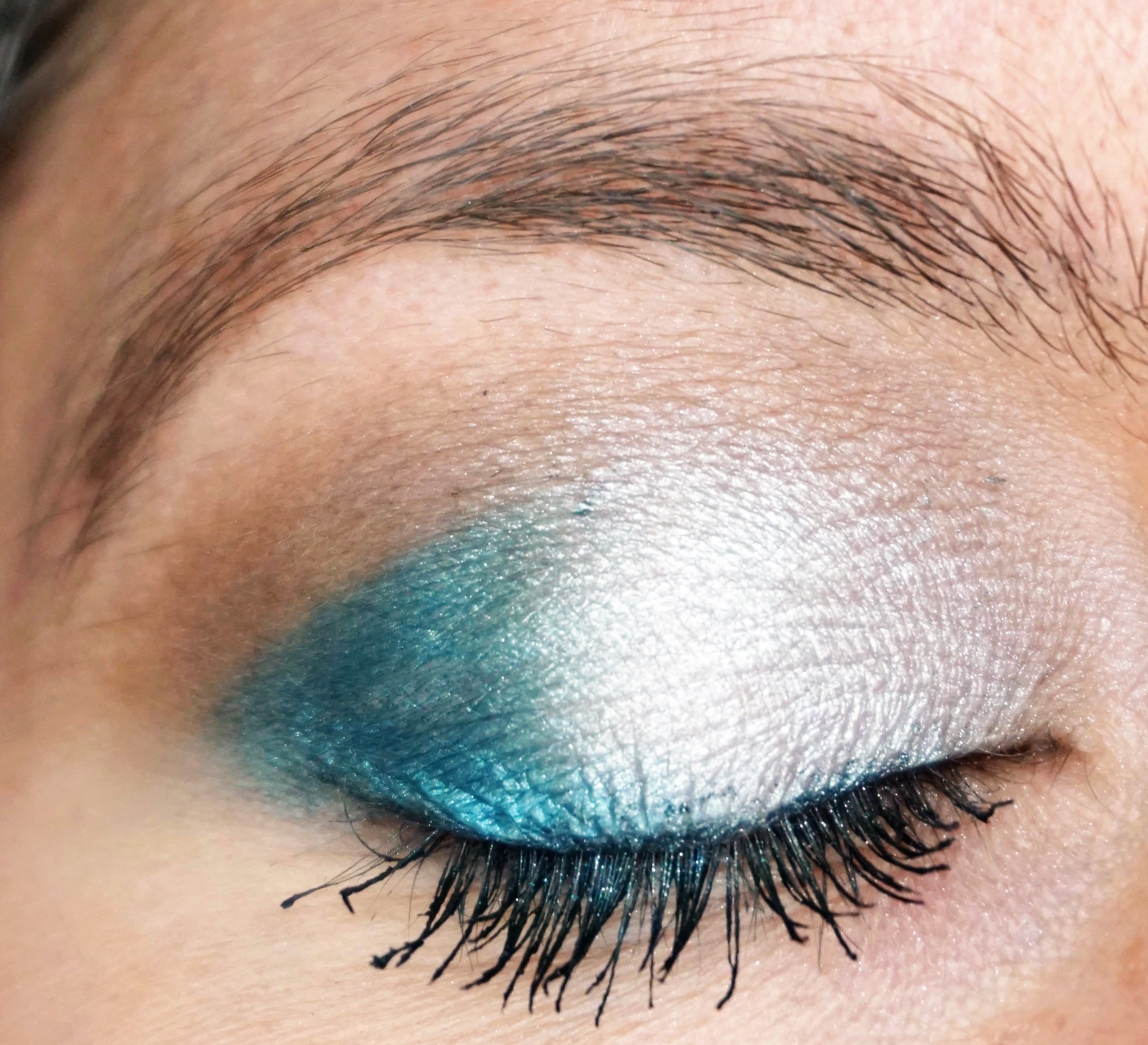 This look is a slightly brighter version of the ‘Twist of Colour’ look I posted recently. For this look, I used a bright, shimmery silver on the lid, cork brown in the crease and a ‘pop’ of bright blue in the outer v part of the lid.