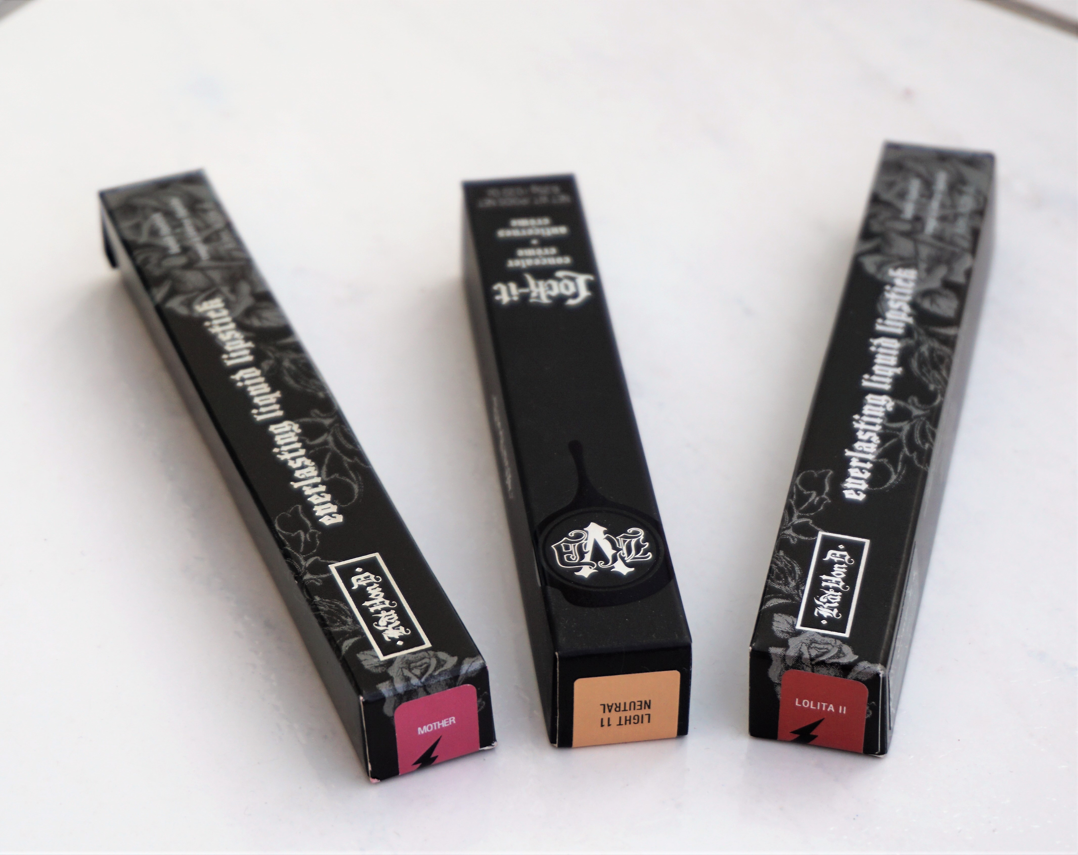 Kat Von D is a brand that I hadn’t tried until earlier this year when I took a trip to Dubai to meet some friends.  I was really excited to see that there was a Kat Von D counter in the Sephora and treated myself to a few products: a concealer (middle in the pic above), a lipstick and two of the Everlasting Liquid Lipsticks (left and right in the pic above).  I like the concealer and lipstick but I particularly love the Everlasting Liquid Lipsticks and so thought it was time for a post!!
